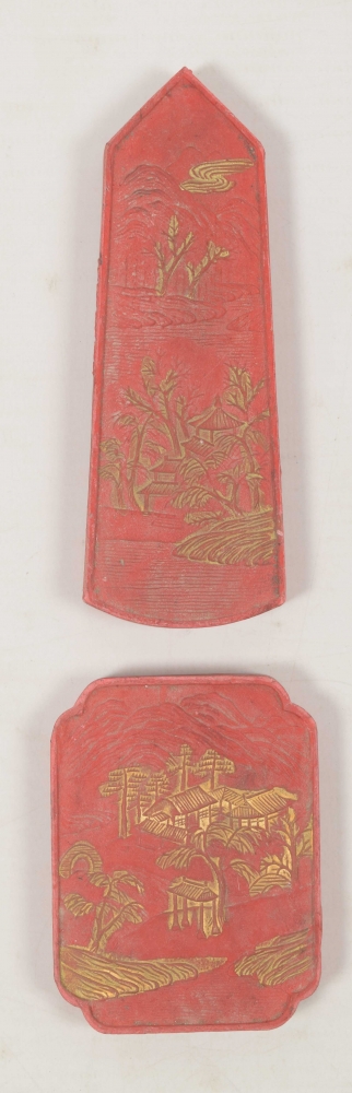 Case with minor defects. And with 1 similar box cont. 8 gilt and coloured Chinese inkstones in various colours and shapes. (total 18)