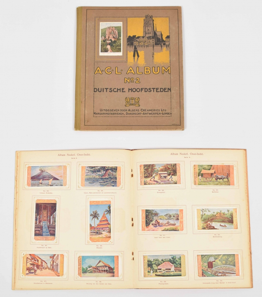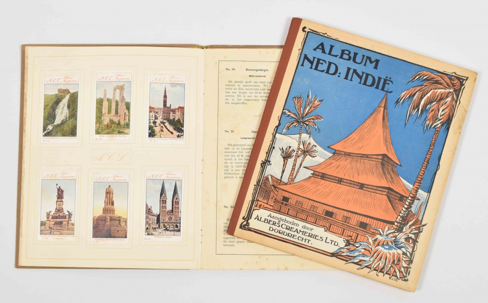 1913. Complete with all 72 insertable cards. Halfcloth + Nederlands Indië door J.L. Hooftman, 1910. Complete with 96 insertable cards. Both in very good condition.