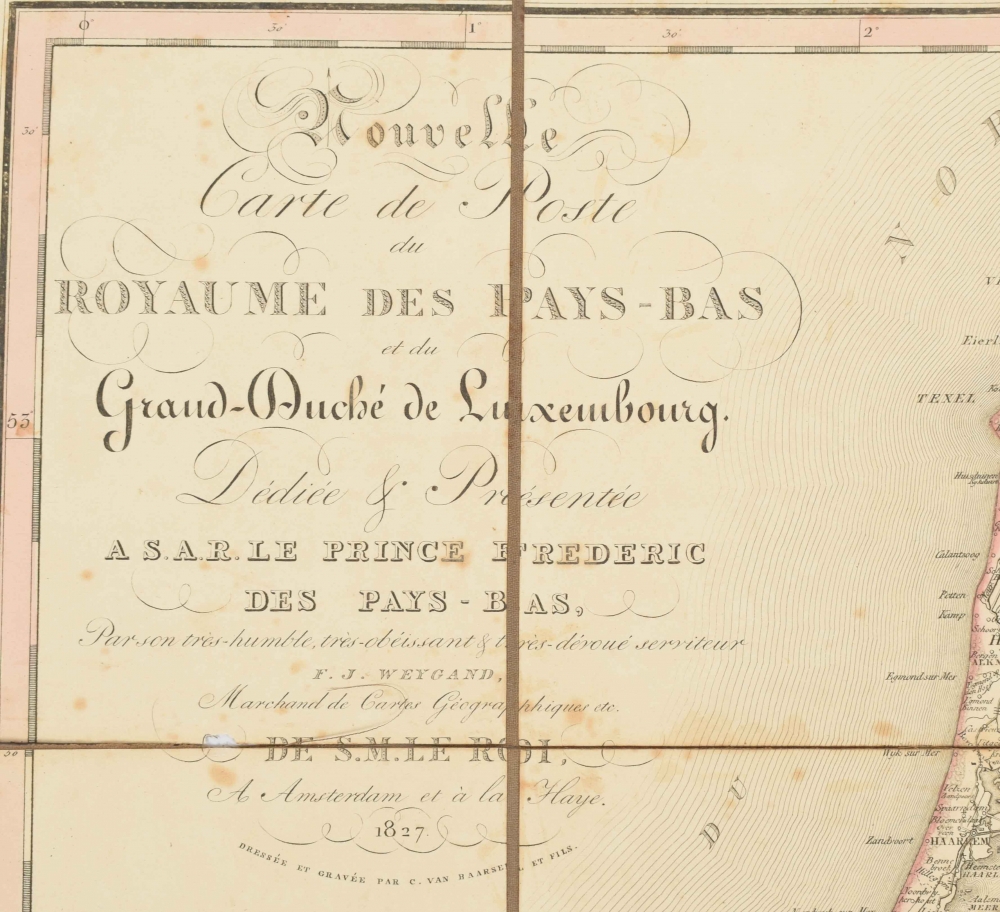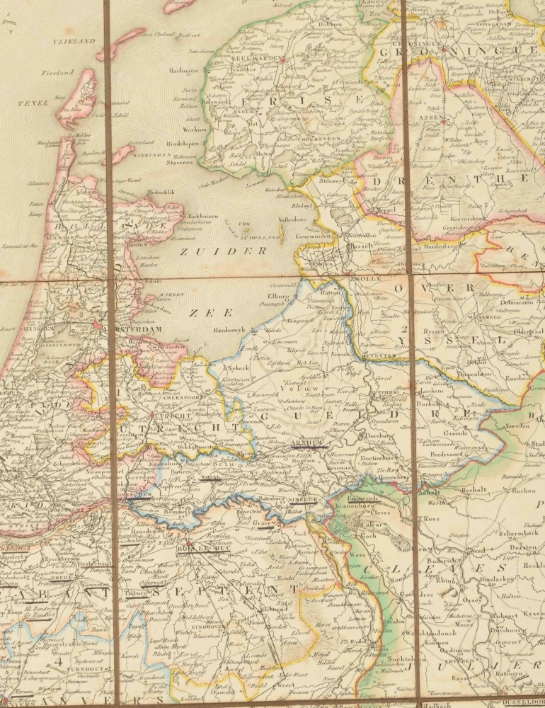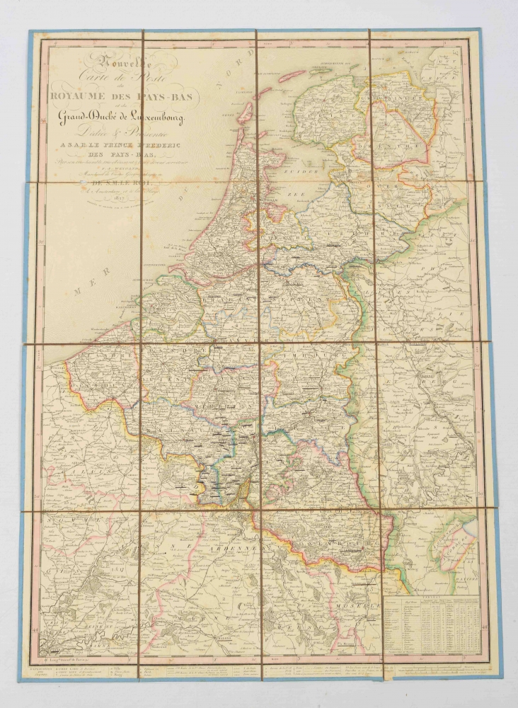 et du Grand-Duché de Luxembourg. (...). Dressée et gravée par C. van Baarsel et fils." Engraved with coloured outlines, 75.5 x 54.5 cm. Amsterdam, F.J. Weygand, 1827, mounted in 12 segments on cloth.