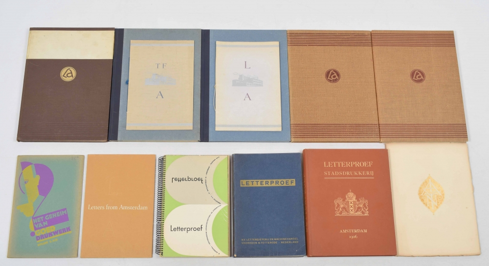 Amsterdamsche Lettergieterij. Letterproef Amsterdamsche Lettergieterij. Amsterdam, c. 1890-1900. Halfcloth, ± 150 p. Fine collection of proofs for advertising, ornaments and vignettes. Several vignettes cut out, some ann. in pencil + Flex. Letterproef N.V. Lettergieterij "Amsterdam" voorh. N. Tetterode. Amsterdam, c. 1950. Cordbound + Beknopte proef van drukletters. N.V. Lettergieterij "Amsterdam" voorheen N. Tetterode, c. 1950. Cloth with loose index with bookmark + 5 similar other multilingual editions by Lettergieterij "Amsterdam" - and 8 more.