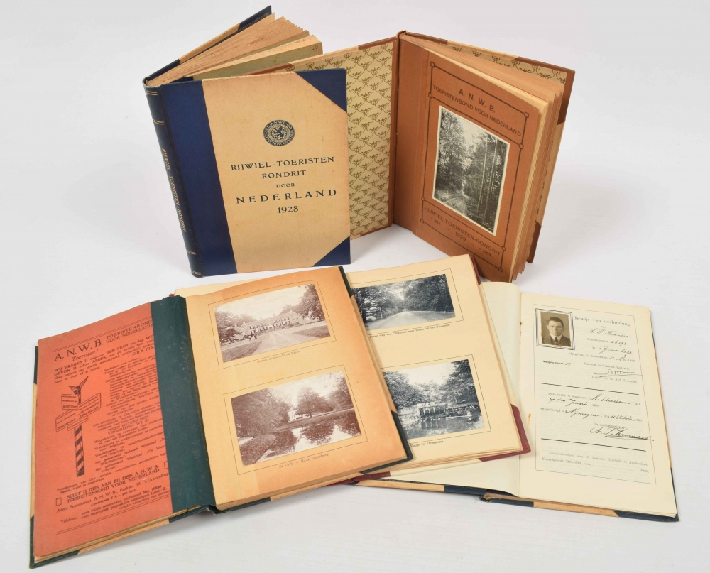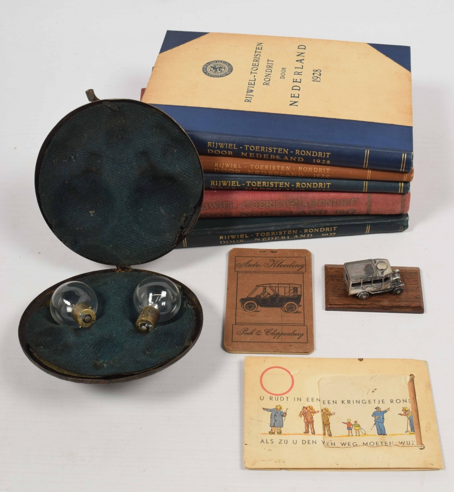 1917, 1927, 1928, 1929, 1930. Each in halfcloth, complete with 40 picture cards. Added: silver miniature car of the Geldersche Tramwegmaatschappij, original lamp holder 1920s (?), notebook Peek en Cloppenburg Auto Kleeding 1914 and leporello A.N.W.B. advertising strip for road signs, 1920s.