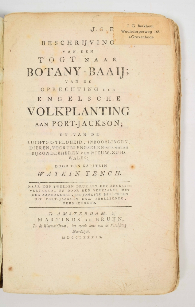 Beschrijving van den togt naar Botany-Baaij; van de oprechting der Engelsche Volkplanting aan Port-Jackson; en van de luchtgesteldheid, inboorlingen, dieren, voortbrengselen en andere bijzonderheden van Nieuw-Zuid-Wales. Naar den Tweeden druk uit het Engelsch vertaald, en door den vertaaler met een aanhangsel, de jongste berichten uit Port-Jackson enz. behelzende, vermeerderd. Amsterdam, Martinus de Bruijn, 1789. x, 212 pp. In plain paper binding, spine supported with modern cloth. Inside good.