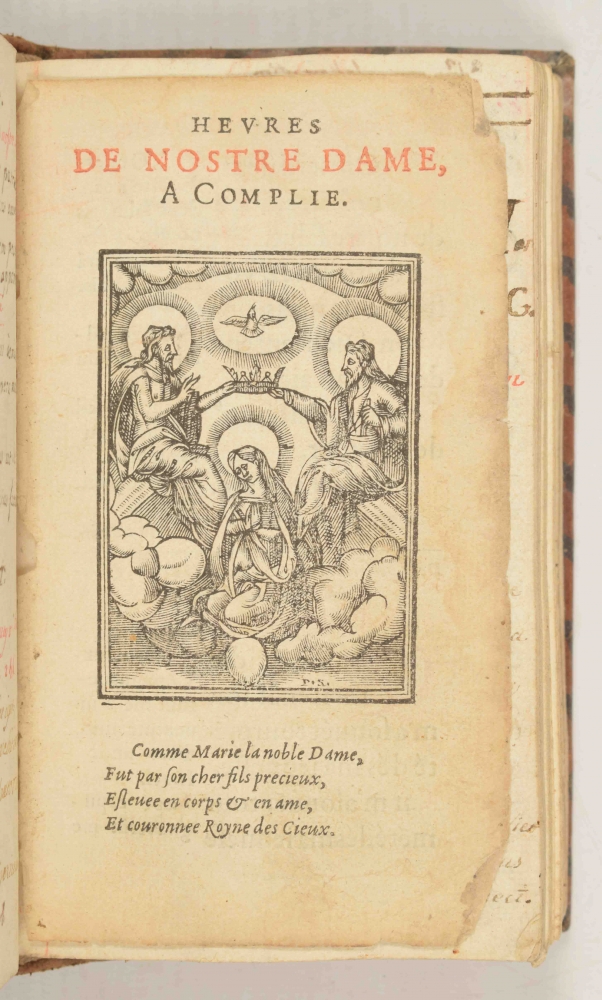 Extensive book of hours, beginning with an index in the order of the days of the year with the matching saints, else an index on "l'office des dimanche", "l'office de la semaine", "le propre du temps", "le propre des saints". The book else contains all usual elements such as the "Heures canoniales", "Le propre du temps", "Le XXV Decembre. Le jour de Noel", "La circonsision de notre seigneur", "Le propre des saints. Le XXX Novembre", "Le XV. Aoust. L'Assompti de la Sainte Vierg.", "De la dedicace de l'eglise", etc. etc. etc.