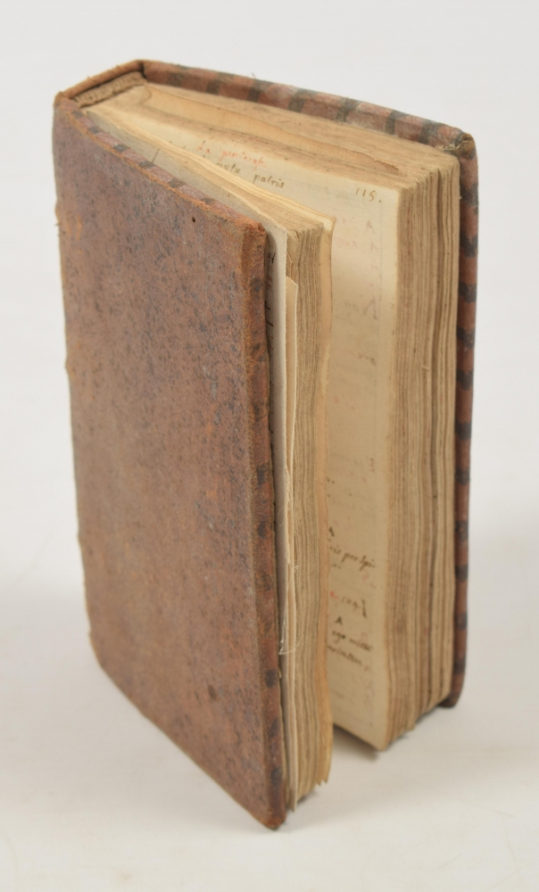 probably Belgium, c. 1700, from the first flyleaf paginated 1-133; (2),159-398,(5) p. (occ. sl. irregular), on p. 6 an engraved frontispiece by Poquet, p. 7-26 comprise letterpress text "Prières du Matin" (from a Catechism edition c. 1700) followed by another 10 letterpress leaves (not included in hand paging), with 9 p. of loosely inlaid contemporary manuscript music scores, contemporary speckled letter with ribbed back, small 8vo.