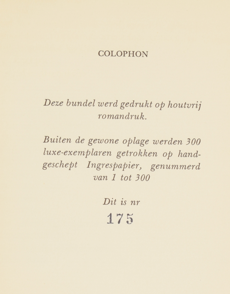 Folkert Woudstra*. De Onbekende weg.... Verzamelde gedichten 1945-1946. Editorial Holanda, Palma de Mallorca, 1946 (?). 4to, cloth + Ward Hermans. Gekluisterde Verzen. Satiren en balladen. "Privé-uitgave", 1960. No. 175/300. 4to, cloth, untrimmed + Ward Hermans. Socratische gesprekken. De ondergang van het westers burgerdom. Uitgeverij de Goudvink, Antwerp, 1964. No wrapper - and Willem Sluyse (Willem Sassen). Die Jünger und die Dirnen. Dürer-Verlag, Buenos Aires, 1954. 223 pp. Later cloth.