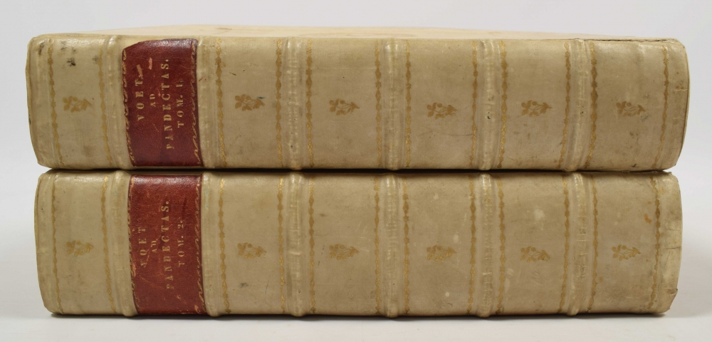 In quo praeter Romani juris principia ac controversias illustriores, jus etiam hodiernum, & praecipuae fori quaestiones excutiuntur. [2 vols.]. Johannis Voet JCti & Antecessoris in Academia Lugduna-Batava [Leiden]. The Hague, Antoni van Dole, 1734.