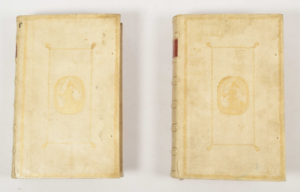 Folio, 2 vols., uniformly bound in vellum with the emblem of the Dordrecht Latin school (Minerva with owl) on both boards in gilt stamping. Title on spine in red and gilt stamping. Titles in red and black with large typographical vignette. Bound at the front of the first vol. the prize diploma of Willem Adolf Hooft, student at the Dordrecht gymnasium, 1852 with the signatures of the exam commission and principal, all ms., ± 2200 pp. incl. both indices. Text with minimal tanning, else a very good set. (total 2)