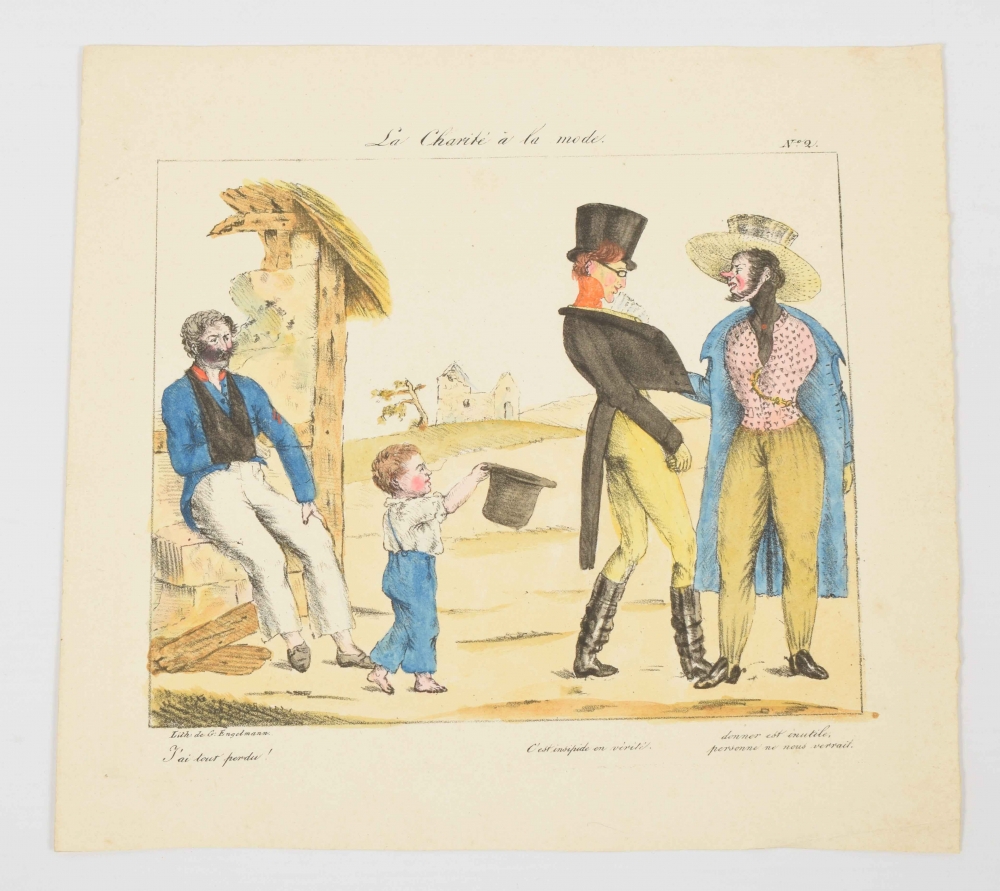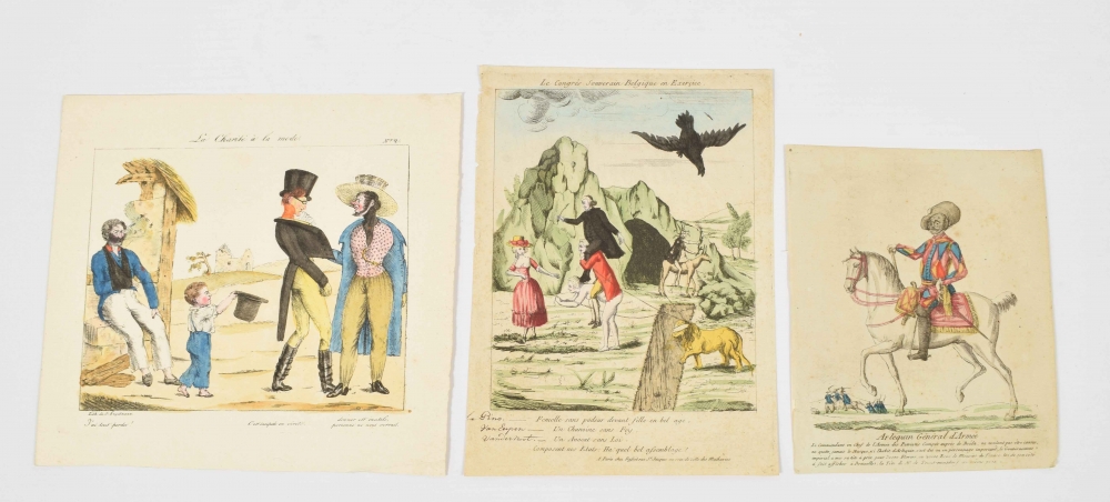 Arlequin général d'armée: le commandant en chef de l'armée patriotes campée auprès de Bréda, ne voulant pas être connu, ne quitte jamais le masque ni l'habit d'Arlequin (...). Handcoloured engraving, c. 1790. 21 x 17 cm. + Le Congrès Souverain Belgique en Exerçice. Femelle sans pudeur devant fille en bel age. Un Chanoine sans Foy. Un Avocat sans Loi. Composent nos Etats: Ha: quel el assemblage! Paris, Rafset, c. 1830. With caption "La Pins, Van Eupen, Vandernoot". Handcoloured engraving. 27 x 20 cm. + La Charité à la mode. Lith. Engelmann, Paris, 1820. 22 x 22 cm.