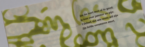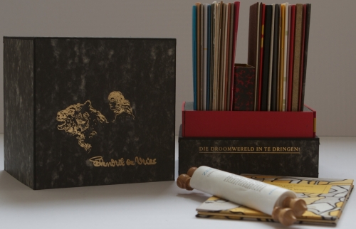 See the Dutch description: Project van drukkers in de marge bij de honderdste geboortedag van Hendrik de Vries. De Typografentafel, Groningen, 1996. Cassette 13,7 x 15,5 x 20 cm. Waarin 30 boekjes en een rol, alle tot dan toe onuitgegeven, op één gedicht na. Gedrukt door 30 verschillende drukkers. Oplage 100 ex.