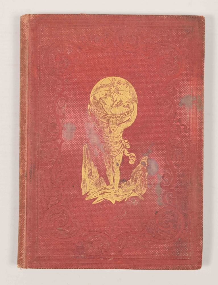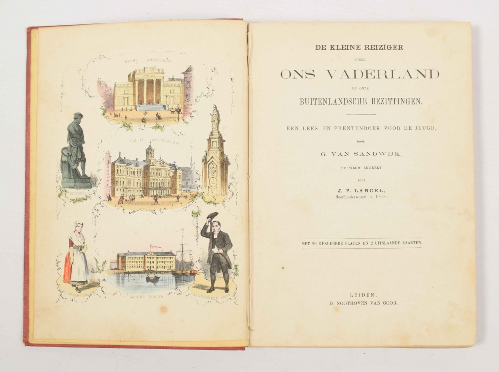 en onze Buitenlandsche Bezittingen. G. van Sandwijk, opnieuw bewerkt door J.P. Lancel. With 20 coloured plates (each plate with several views and/ or portraits) and 2 folding maps. Leiden, D. Noothoven Van Goor, [1870]. Red cloth, title on spine and front board with Atlas carrying the world in gilt stamping.