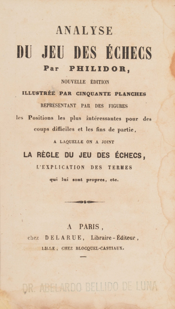 Nouvelle édition illustrée par cinquante planches représentant par des figures, les positions les plus intéressantes pour des coups difficiles et les fins de partie, a laquelle on a joint La Règle du Jeu des Échecs (...). Paris, Delarue/ Lille, Blocquel-Castiaux, [c. 1850].