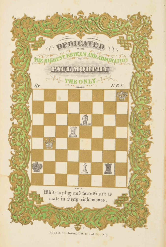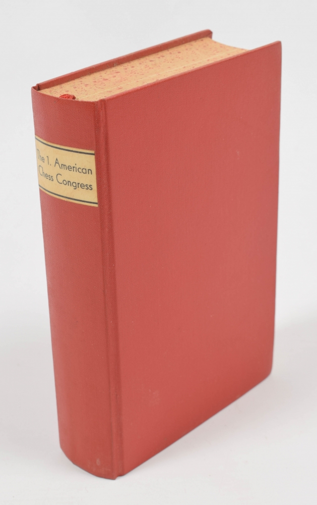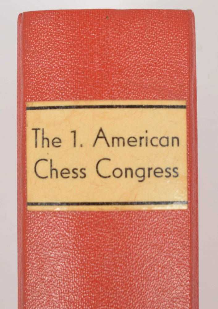 Containing the proceedings of that celebrated assemblage, held in New York, in the year 1857 (...). Daniel Willard Fiske. New York, Rudd & Carleton, 1859. Small 8vo, newer faux-leather binding, title with small vignette, engraved and coloured frontispiece with chess problem dedicated to Paul Morphy, XII,563 pp. and catalogue. Historical sketch, the games, blindfold chess, games from the problem tournament and various essays also published in "Chess Monthly". Pages 251-254 in photocopy. This copy was presented by W.H. Gwyer to The Capital City Chess Club.