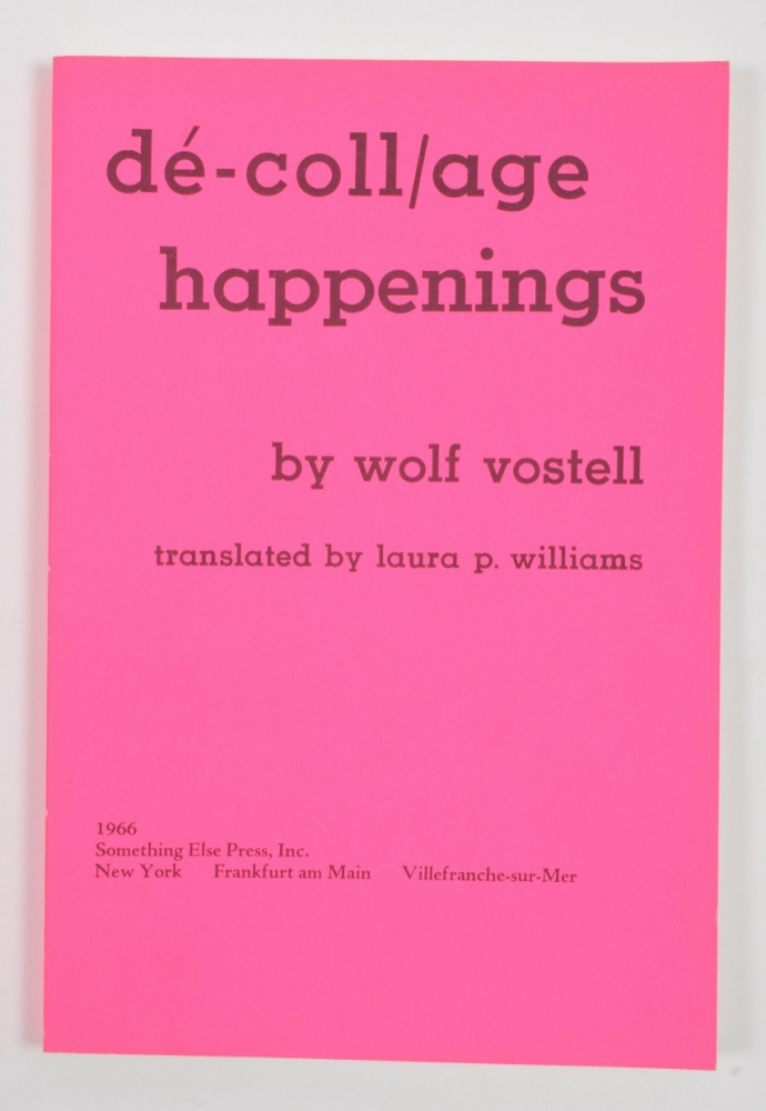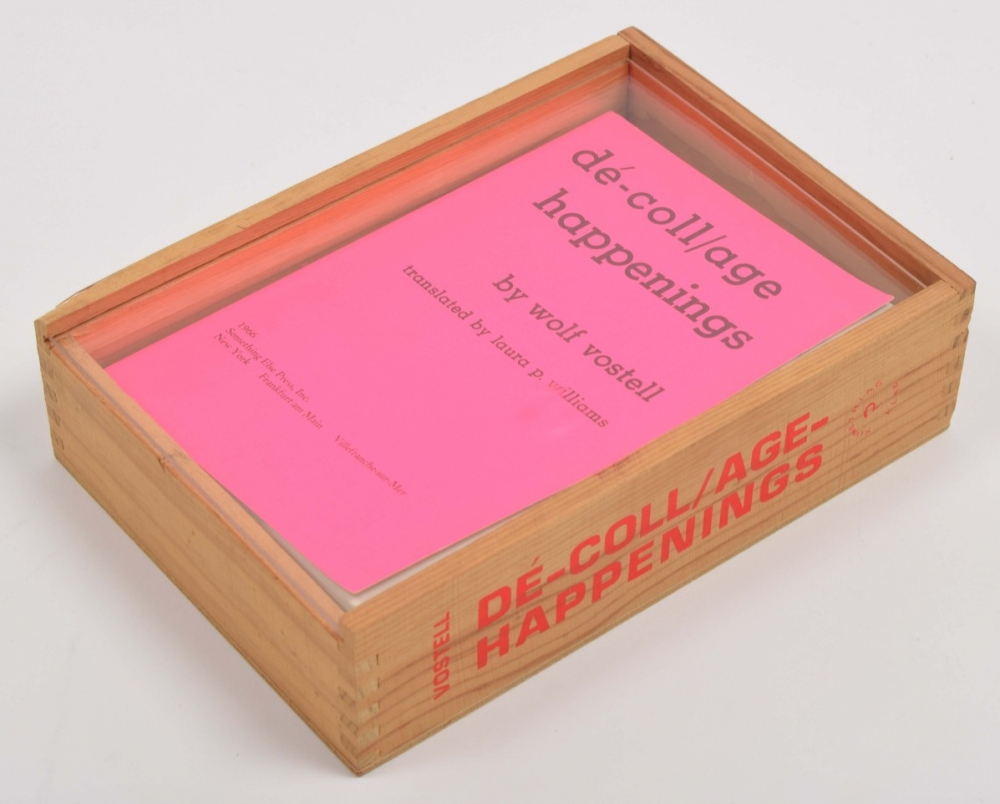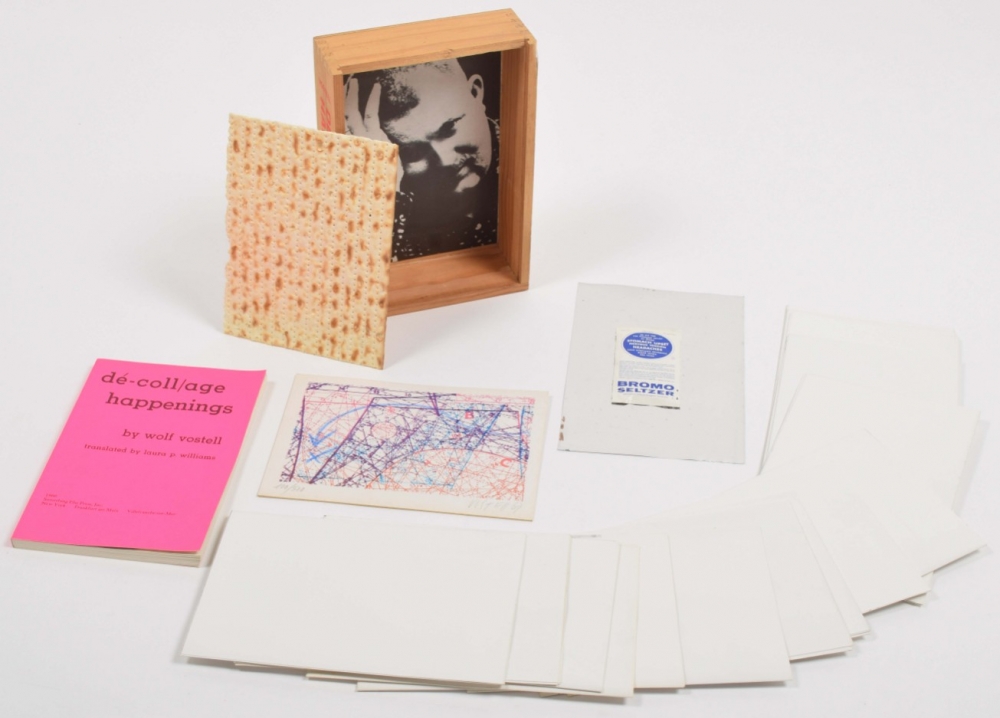 Added in the box are a matzo cracker, 15 artist posters, a mounted Bromo seltzer packet, and a portrait of the artist. The book features documentation of Vostell's most important happenings between 1954 and 1966, 99 pp. All items, including the fragile matzo, are in mint state.