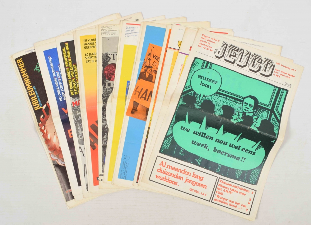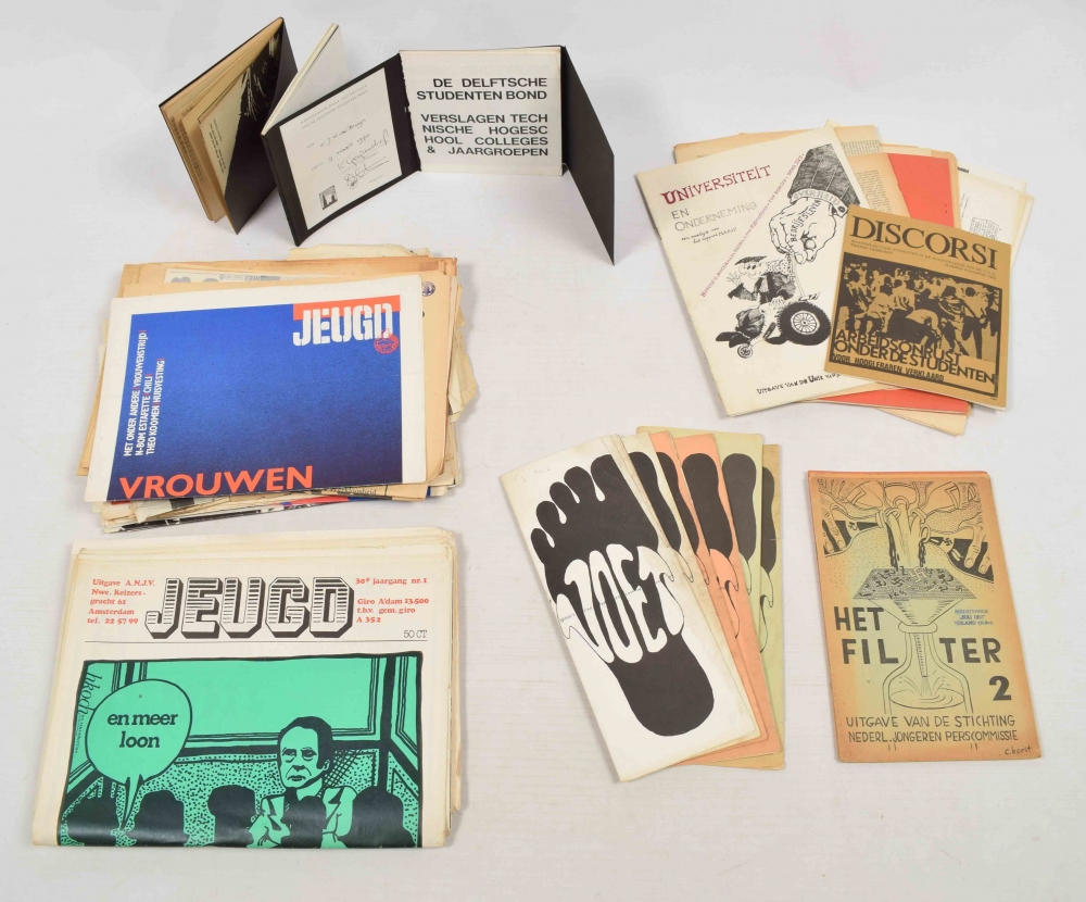 Het Filter nos. 1, 1A and 2. Uitgave van de Stichting Nederl. Jongeren Perscommissie, 1938-1939 + Voetspoor. 6 issues, 1969-1970 + Politeia. Socialistisch studentenorgaan van de D.S.S.V. "Politeia". 5 issues, 1968 + Esjee, 3 issues. Socialistische Jeugd, c. 1969 + Almanak Delftsche Studenten Bond 70 in slipcase + Jeugd. 33 issues, 1970s. Published by ANJV Amsterdam + Integraal, 2 nos. + 1 double. School newspaper with comics, stapled - and other similar publications.