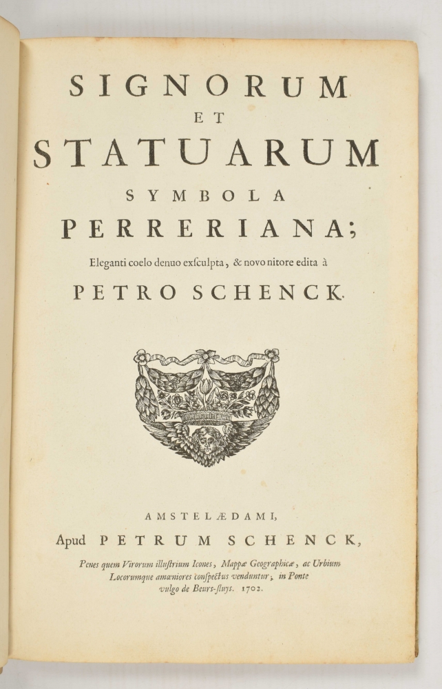 Eleganti coelo denuo exsculpta, & novo nitore edita à Petro Schenk. Amsterdam, P. Schenk, 1702, with letterpress title page, index (3 p., text in Latin and Dutch by Ludolphus Smits) and privilege (1 p.), mezzotint portrait by Schenk of Christian Eberhard (to whom the work has been dedicated), engraved dedication and 100 numbered plates (plates 99 and 100 double-page), contemporary vellum gilt in panels, folio.