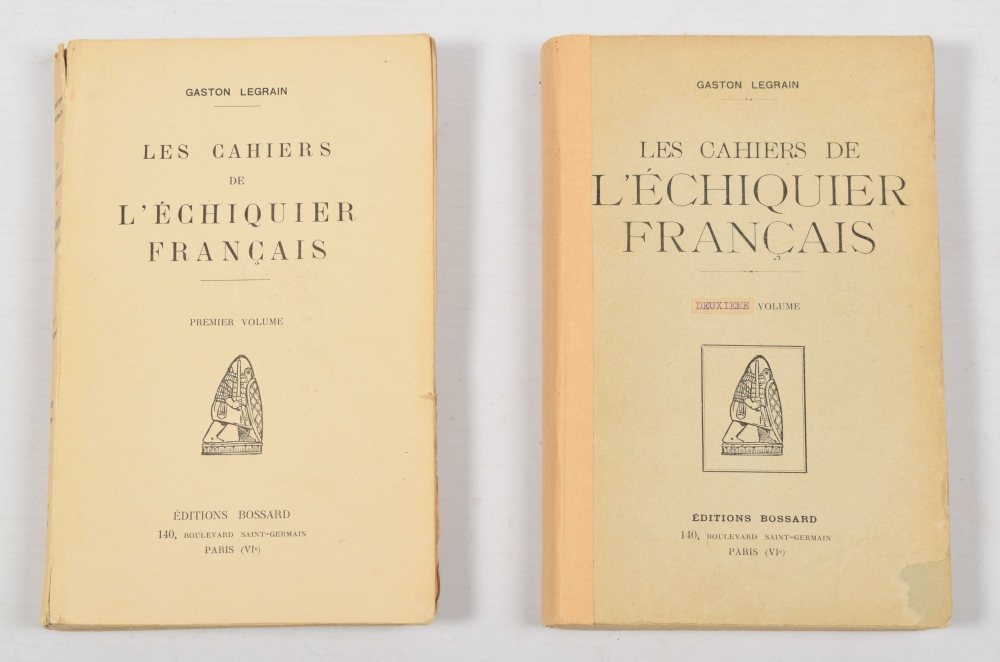 Gaston Legrain. Les Cahiers de L'Echiquier Français. Premier + Deuxieme Volume. Editions Bossard, Paris, 1925-1928 and 1929-1932. The first 2 vols. (of 4). XII,512 and XII,512 pp., sewn, 2x title on wrapper with vignette; spine vol. II strengthened.
