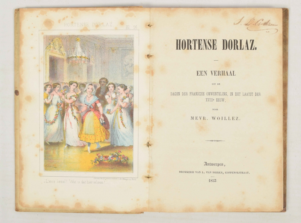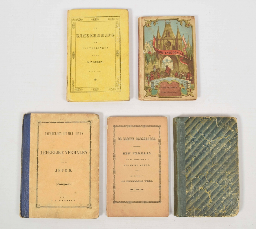 In het laatst der XVIIIe eeuw. Mevr. C. Th. Woillez. Antwerp, L. van Dieren, 1853. With 4 chromolithographs by Engelmann & Graf [and probably issued by Lutkie and Cranenburg at Den Bosch in a collaborative effort, see front board] + Nuttige Tijdkorting (from Tijdschrift Philarete). Amsterdam, J. v.d. Beek, 1841. With 3 handcoloured engravings + De Kinderkring. Karel Blumauer. Gorkum, J. Noorduyn, [1833]. With handcoloured frontispiece and another 3 handcoloured engravings + De kleine Marskramer. Een verhaal uit de oorkonden van Den Huize Arkel. Amsterdam, Ten Brink & De Vries, 1842. With an illus. frontispiece by D. Sluyter after H. Oosterhuis and another 2 engravings + Tafereelen uit het leven of leerrijke verhalen. G.H. van Lingen. Tiel, J.A. Faasen, 1853. With a colour lithograph by C.W. Mieling.