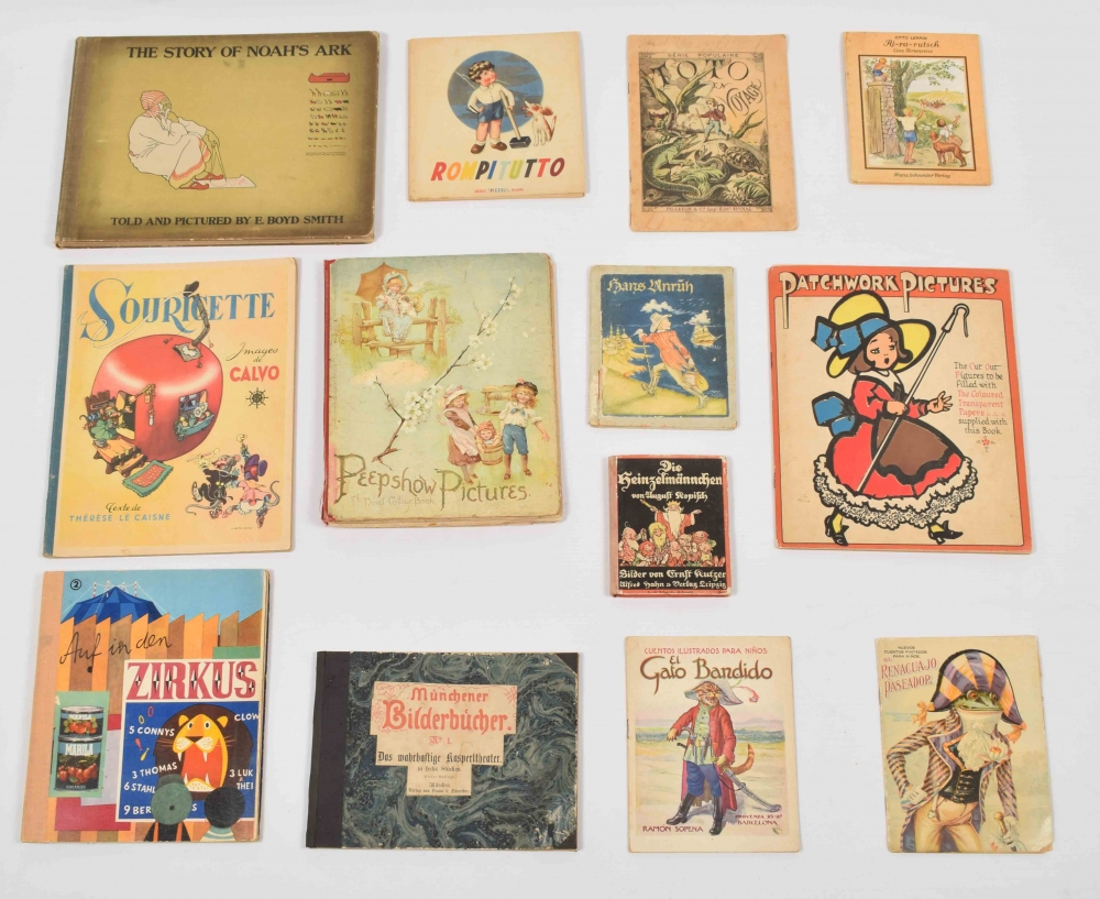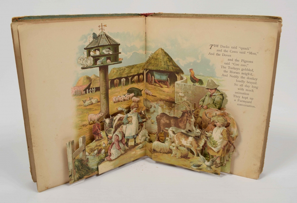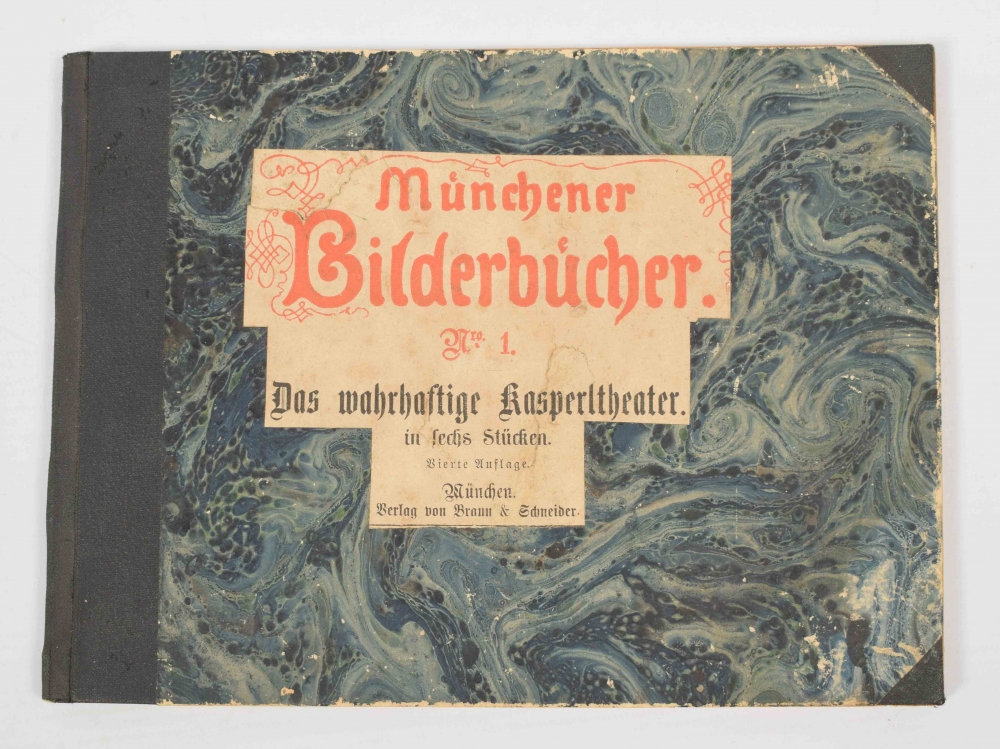 A novel Colour Book. (London), Ernest Nister/ (New York), E.P. Dutton, 1890. Complete with 4 pop-up scenes. Pages loose and partly reaffixed, contemp. inscription to endpaper. Some wear and soiling to front board and spine. Pop-ups in good condition + Das wahrhaftige Kasperltheater in sechs Stücken. Carl Reinhardt. Braun und Schneider, Munich, vierte Auflage, c. 1882. In later halfcloth with mounted title p. + Patchwork Pictures. Raphael Tuck & Sons, c. 1920. 6 cut out figures to be filled with Coloured transparent papers. With inset Dutch manual - and 9 more.
