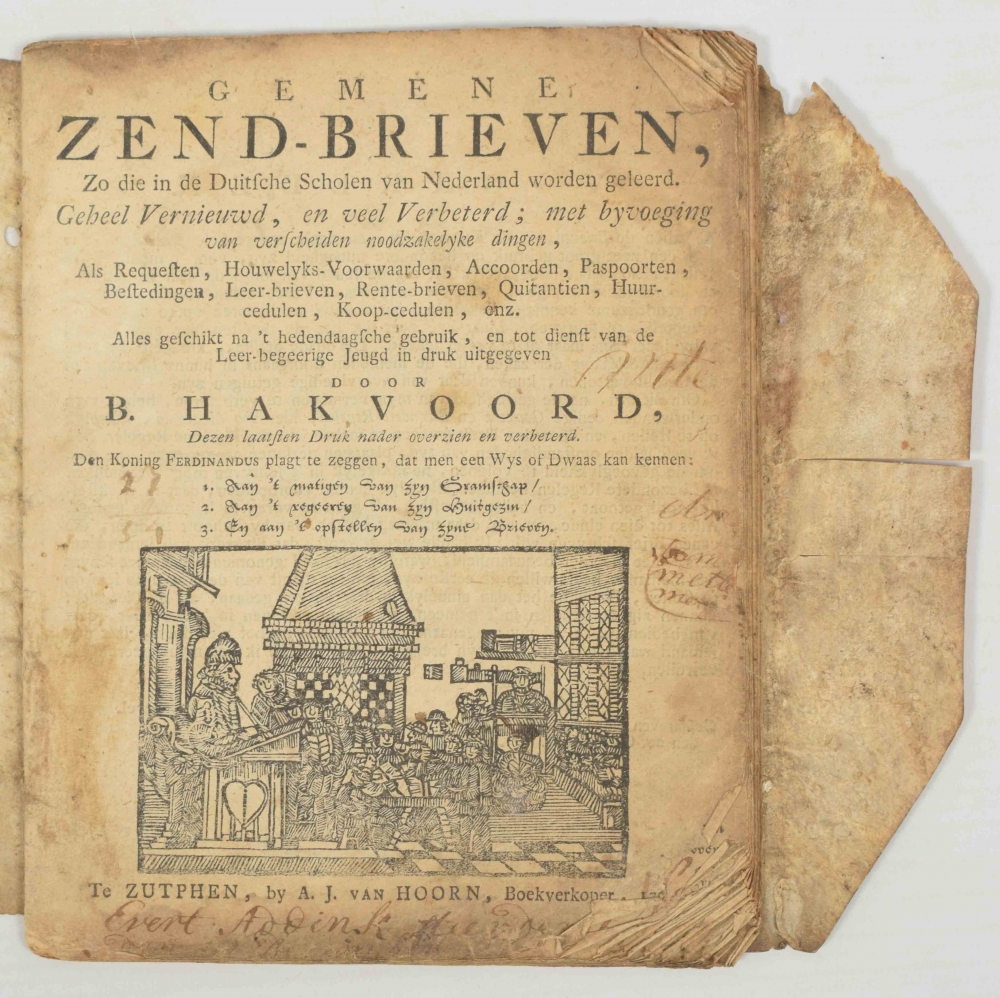 zo die in de Duitsche Scholen van Nederland worden geleerd. Geheel vernieuwd, en veel verbeterd; met bijvoeging van verscheiden noodzakelyke dingen (...) tot de dienst van de leer-begeerige jeugd in druk uitgegeven door Barend Hakvoord, dezen laatsten druk nader overzien en verbeterd. Zutphen, A.J. van Hoorn, n.d. (c. 1765), 40 p., printed in various fonts incl. civilité, woodcut title illustrations of a school class and initials, contemporary cordbound turned vellum wrapper with plain lock, small 4to size (quires of 8 leaves).