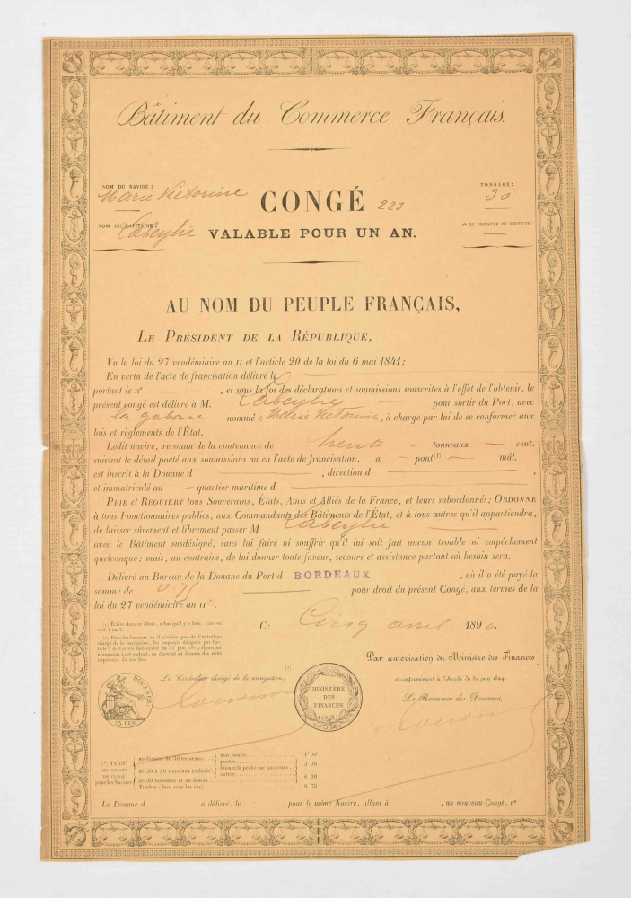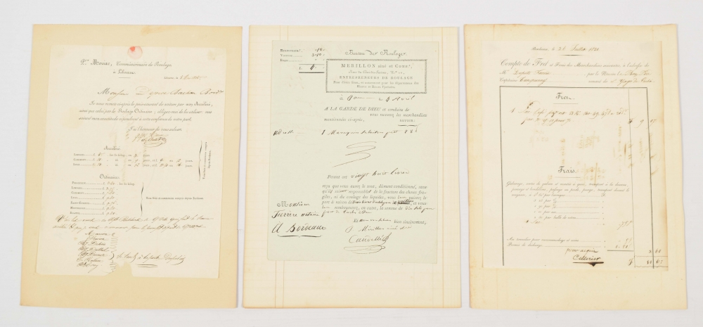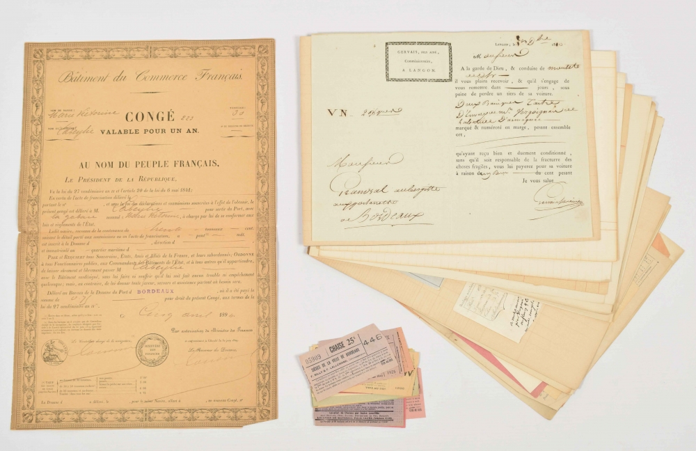 20 quotations and written agreements regarding freight transport (1810-1860), 15 tickets for the Bordeaux area (c. 1925), 10 flyers in French with travels and prices (c. 1920) and 1 permit for offering freight services in the port of Bordeaux (1894).