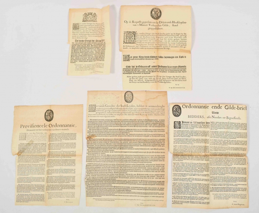 All but the smallest with tears/ small tears to folds (restored with tape); the largest waterstained; several minor other defects. Documents have been previously bound together and with annotations of varying length in pen related to the contents on reverses. Extremely rare placards, no copies in PiCarta. Contains: (1) Ordonnantie ende gilde-brief vande bidders, ofte nooders ter begraefenisse. Leiden, 29 May 1659, signed in print by G. van Hoogeveen; (2) Provisioneele ordonnantie, dienende tot het verhuyren van rouw-mantels. Leiden, 18 December 1670, signed in print by F. Meerman; (3) Die van de Gerechte der Stadt Leyden, hebben in aenmerckinghe vanden jegenwoordigen bekommerlijcken tijdt (...) op 't stuck vande Nachtwacht (...) by forme van ampliatie ofte alteratie van de Keure op deselve Nachtwachte te beramen de naervolgende ordre. Leiden, 25 May 1672, signed in print by J. van Groenendyck; (4) Die van de Geregte der Stad Leyden (...) raeckende die geene, die binnen off buyten dese stat komen te trouwen tot subventie van het Arme Weeshuys alhier gearresteert, hebben goedgevonden deselve ordonnantie te amplieren, ende nieuweijcks ter neder te stellen als volgt. Leiden, 9 August 1696, signed in print by J. van Groenendyck; (5) Op de requeste gepresenteert by deken ende hooftluyden van 't mantel-verhuyrders gilde stond geappostilleert. Leiden, 26 June 1704, signed in print by P. van Groenendijk. (total 5)