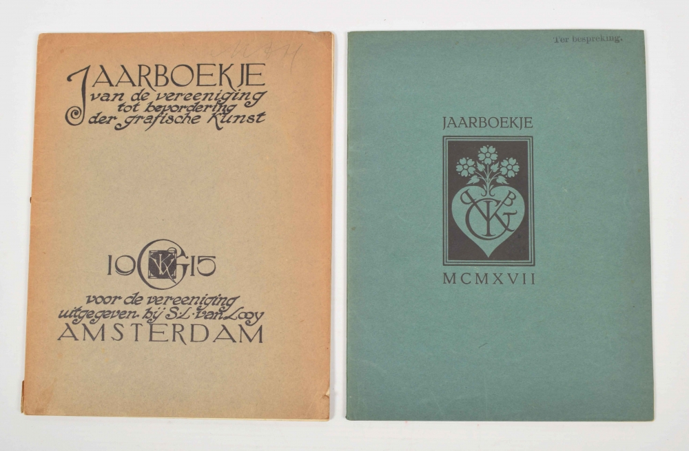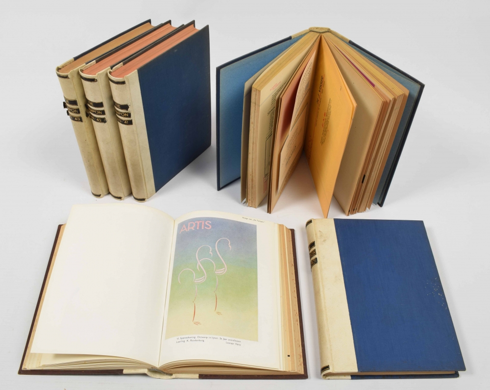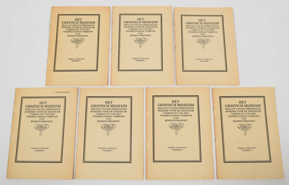 Orgaan voor de leerlingen en oud-leerlingen der School voor de Grafische Vakken te Utrecht. Years 18-23, 1937-1943. Years nearly uniformly bound in half faux-vellum with letterpieces on spine. Bound with orig. wrappers. Several letterpieces dam./ tender, else good + Jaarboekje voor grafische kunst. Vereeniging tot bevordering der grafische kunst. 4 vols.: 1915, 1917, 1919-1920 and 1921-1924. Rotterdam, W.L. & J. Brusse. Vol. 1921-1924 loose in wrapper - and Het Grafisch Museum. Year 3 nos. 1 and 3, year 4 nos. 1-5, 1933-1934.
