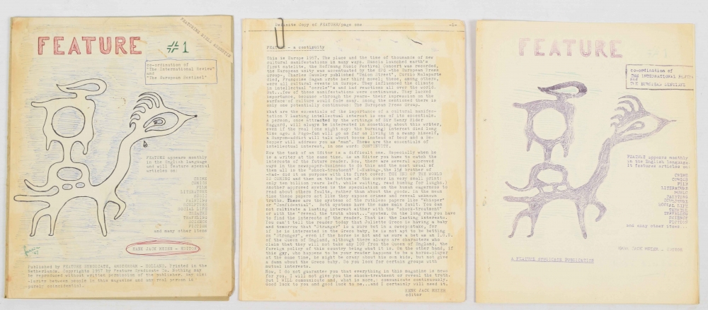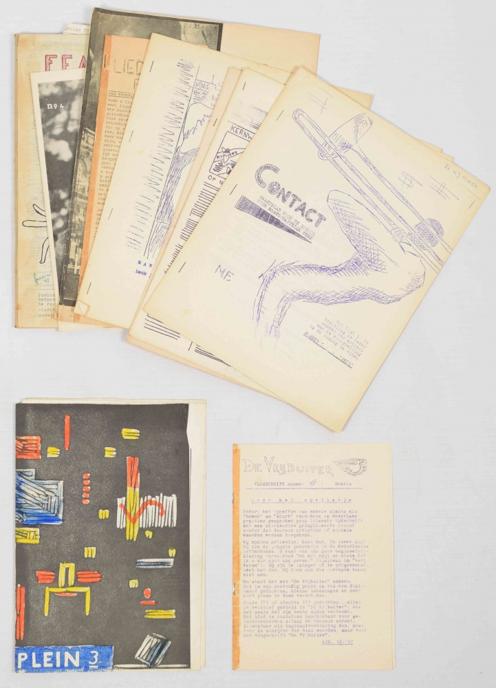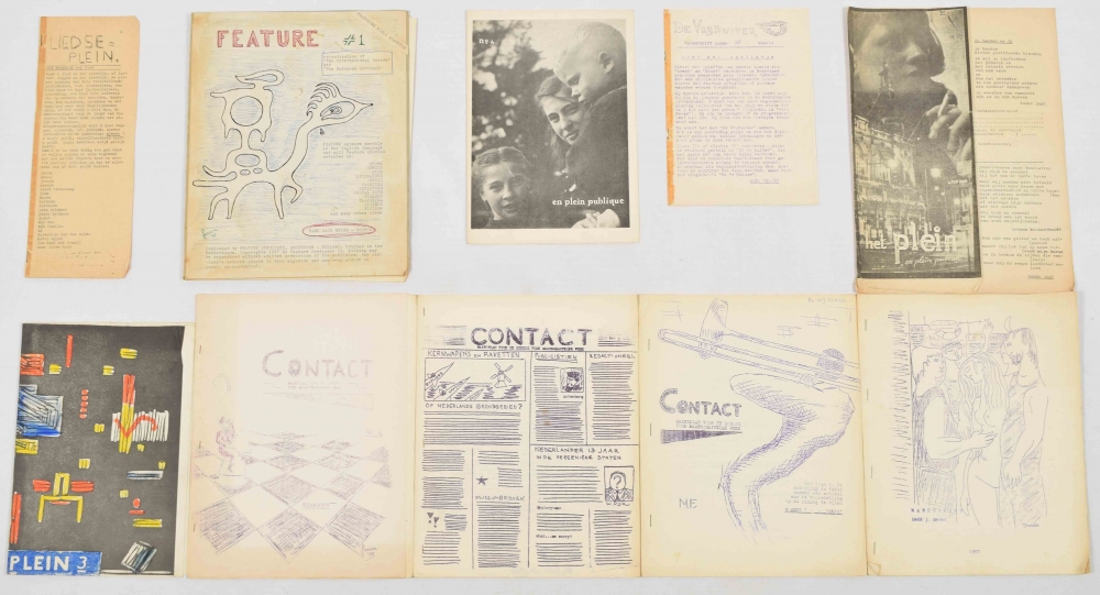 De Vrijbuiter. Vlugschrift nummer #. Dec. 1957. 7 pp. Stencilled, private press + Feature. Volume 1, number 1. Ed. Hank Jack Meijer, Amsterdam, 1957. Featuring Niels Augustin. 14 pp. Handdrawn/ stencilled and pasted source version and the publication itself + Vol 1, no. 2 + Plein nos. 1 (?) and 2-4. With contributions by Apie Prins, Bouke Jagt, Henk J. Meier and others + Manuscript. Henk J. Meier. 1957. Stencilled, private press + Contact no. 1-3, 1958. Stencilled, private press (no. 1 with inscription 'Ex H.J. Meier').
