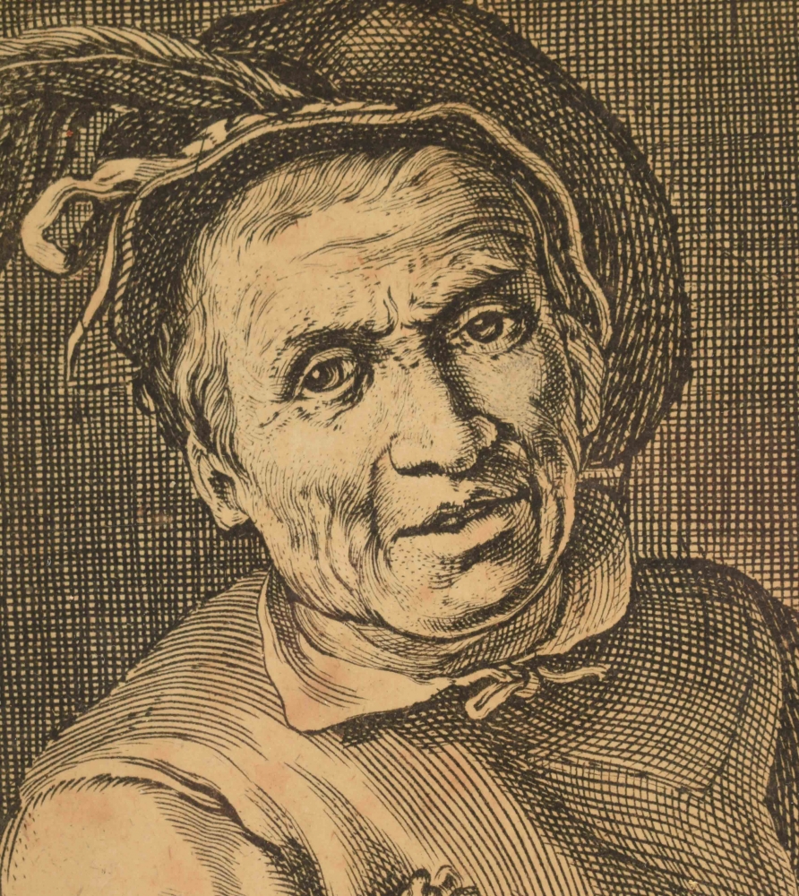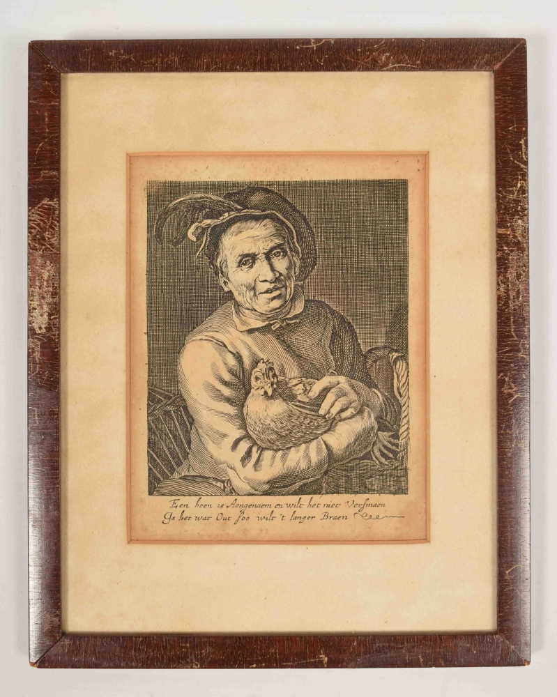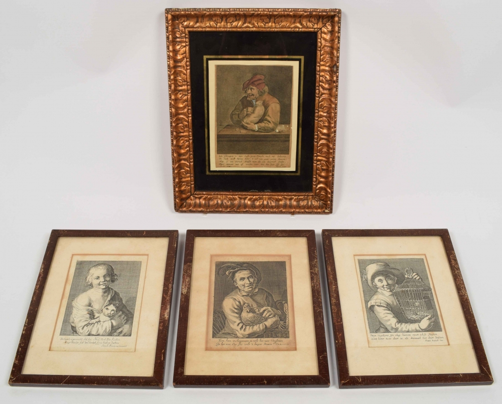Handcoloured copper engraving by C.J. Visscher after the design by Adriaen Brouwer, c. 1650. Framed in mount under glass. Frame 37 x 30 cm., engraving 19 x 14 cm. Added: 3 framed engravings with portrait and proverb, c. 1700.