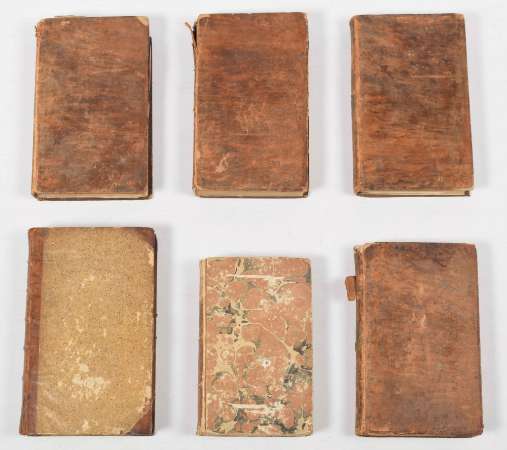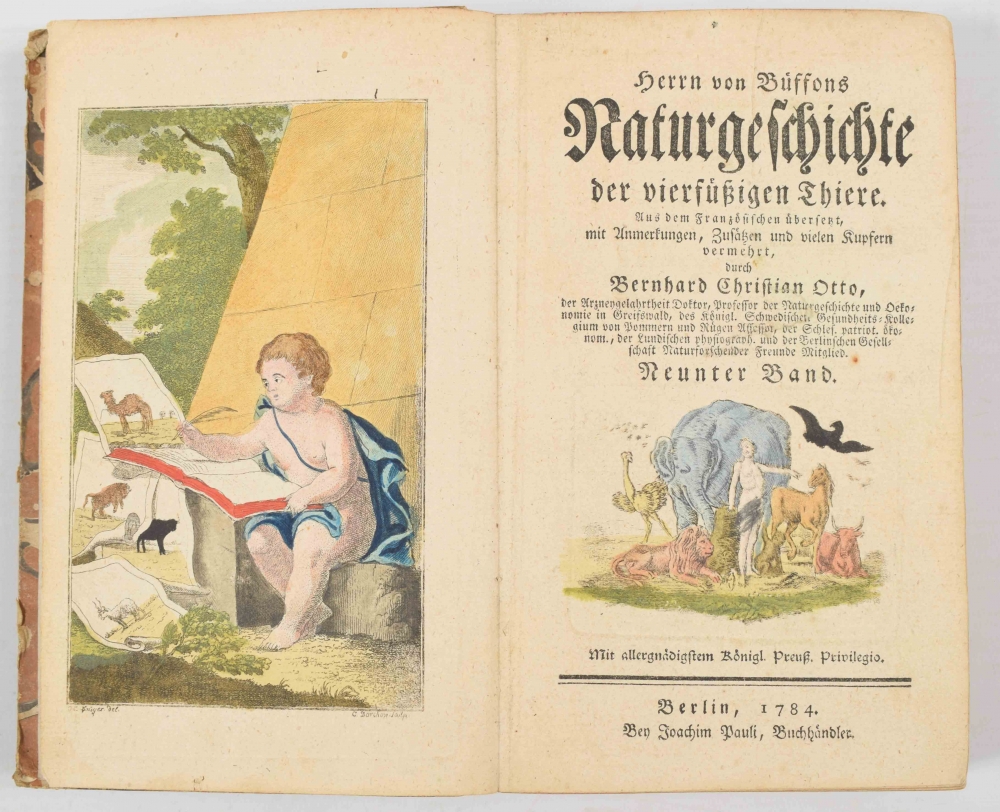 (...) übersetzt durch Bernard Christian Otto. Neunter Band. Berlin, Joachim Pauli, 1784. Vol. IX, cased, illustrated and handcoloured frontispiece, title with handcoloured vignette and 26 handcoloured copper engravings of mostly subtropical and tropical animal species. Fine colouring. Combined with: Bijbel der Natuur. Dr. F.A. Busching (trsl.) Laurentius Meijer. Vol. 3, first part. Dokkum, 1786, with 3 copper engravings + 4 vols. of Katechismus der Natuur. J.F. Martinet. Johannes Allart, 1782-1789. With several folding plates in copper engraving (partly handcoloured). Shabby bindings. Sold w.a.f.