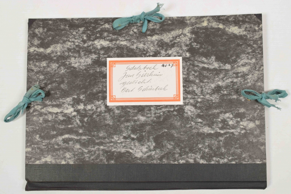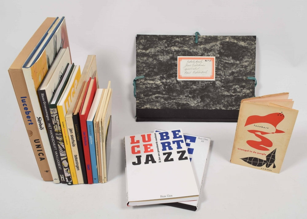 Schetsboek Jan Sierhuis. Gedicht Bert Schierbeek. 1974. Loose-leafed in halfcloth folder with marbled boards. Signed copy, no. 27/750 + 3 more by or on Jan Sierhuis + Lucebert. Triangel in de jungle. The Hague, A.A.M. Stols, 1955. 2nd ed. Cardboard wrapper with dust jacket + another 6 vols. with collected poems by Lucebert + Ik ben een gemankeerde saxofonist. Lucebert & Jazz. Amsterdam/ Rimburg, Huis Clos, 2013. Sewn with cardboard wrapper, in cassette. With 2 CD-ROMs - and 3 more.