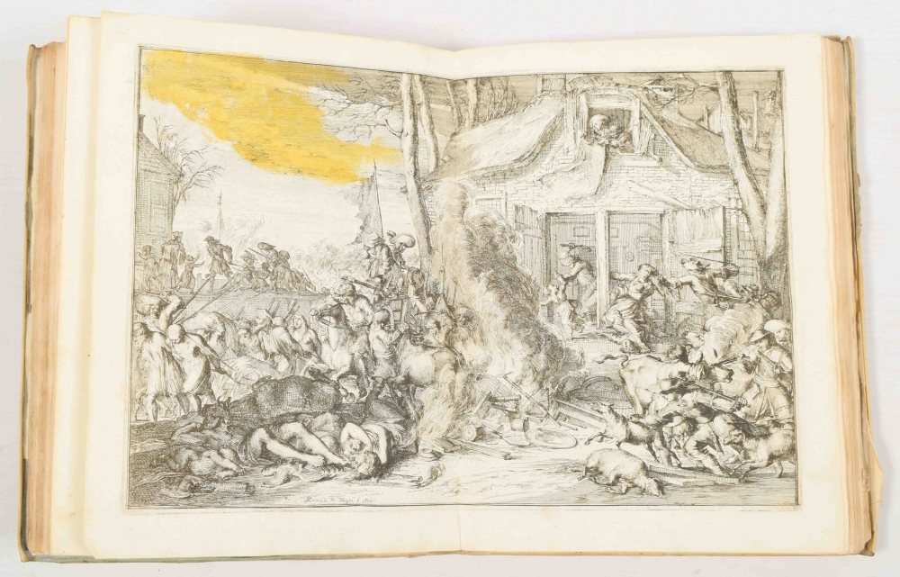 Turned vellum, 4to, title with vignette, 202 pp. Complete with 8 double-page plates by Romeyn de Hooghe in etching/ engraving (several partly or fully shabbily coloured); the last two with 2 images each. Vellum binding with scratches and staining. Seal in red wax and name to endpaper, last leaf tender. De Hooghe's splendid prints in the "Advis fidelle" are among the highlights of his work. See Landwehr 30.