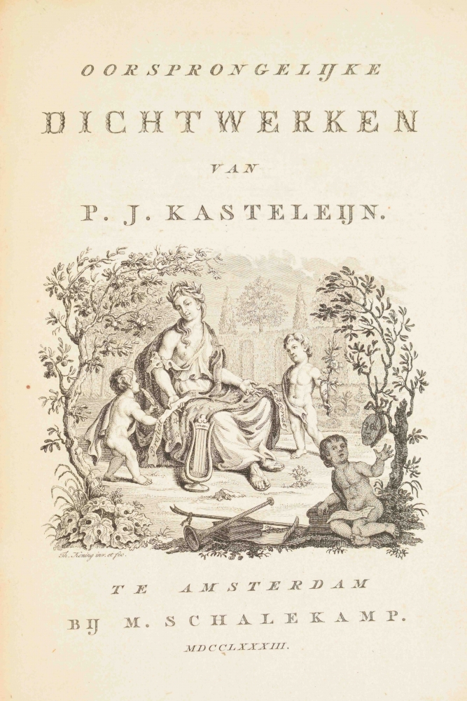 Amsterdam, M. Schalekamp, 1783. [2 parts in one vol.]. Sewn, 2x title with large vignette by Th. Koning, (4),134,(2) and (4),128,(4) pp., bookplate + Moliere, Blijspel door P.J. Kasteleijn. Amsterdam, A. Borchers, 1781. Halfleather, 96 pp. With portrait of Moliere by J. Punt and illustrated frontispiece by C. Bogers after Ekels + Carolina van Eerburg, of de Rampen der Liefde; Toneelspel (...) door P.J. Kasteleijn. Amsterdam, Willem Holtrop, 1788. Marbled paper wrapper, illustrated frontispiece by R. Vinkeles after J. Buys. 139 pp. + Elfride, Treurspel. Amsterdam, P.J. Uylenbroek, 1787. Sewn, 96 pp., with an engraving by H.L. Mijling after J. Buys. Good copies.