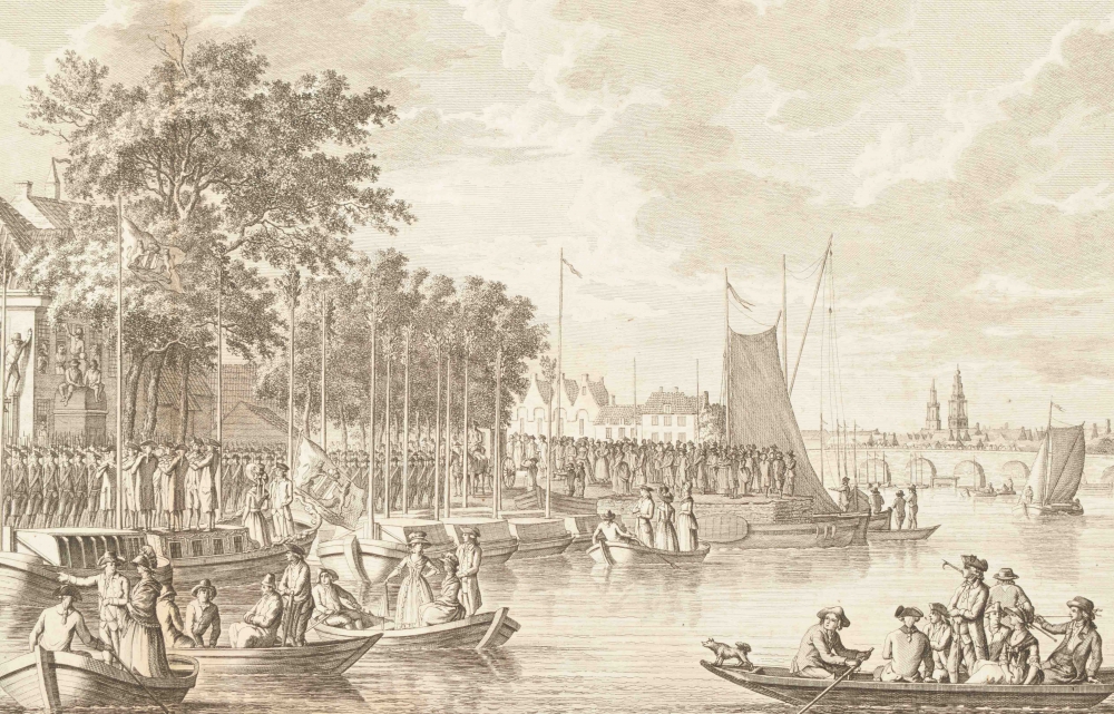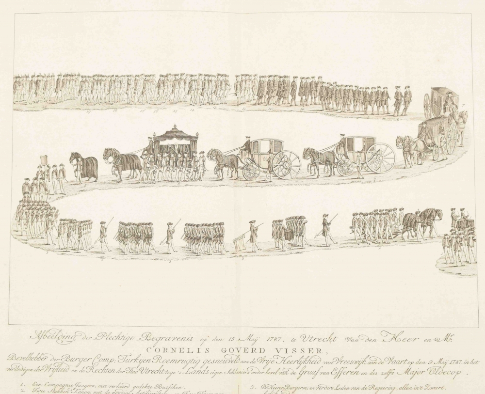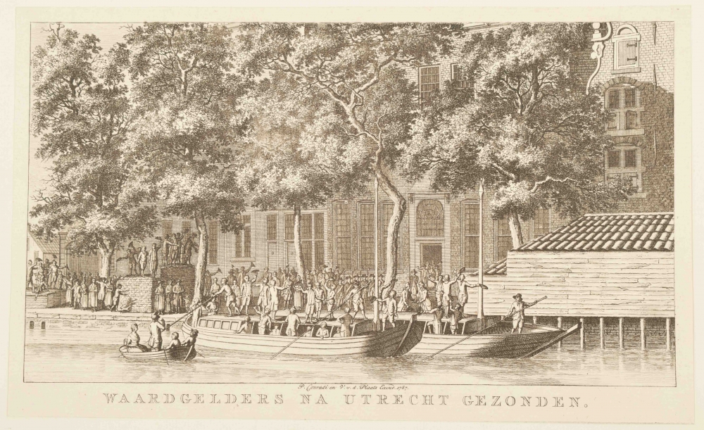Zoals dezelfde zich vertoonde by de verlating, snachts tusschen den XV. en den XVI. September 1787. Proof, etching/ copper engraving by Joh. Jelgershuis Rienkz, 37 x 47 cm. + Uittogt van zeshonderd gewapende Amsterdamsche Burgeren na Utrecht den 17den van Hooimaand des jaars 1787, opgedragen aan alle uitgetrokke Burgeren. A. Borchers & J.E. Grave after G. Grypmoed. 1788, copper engraving, proof, 32 x 47 cm. + Waardegelders na Utrecht gezonden, by P. Conradi & V. v.d. Plaats, 1787 + 5 smaller prints of the departure of 1787.