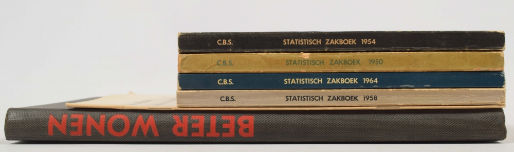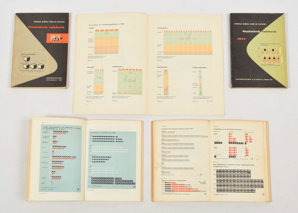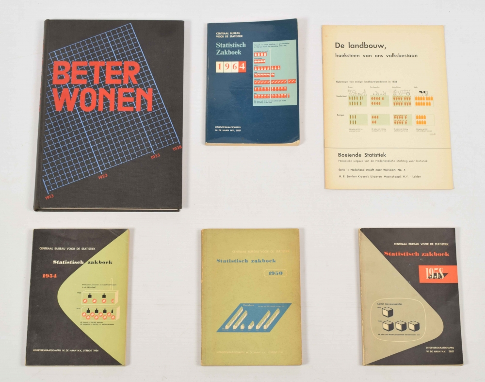 gewijd aan het werk der woningbouwvereenigingen in Nederland, uitgegeven t.g.v. het 25-jarig bestaan van den Nationalen Woningraad, Algemeenen Bond van Woningbouwvereenigingen 1913-1938. K. Limperg, J. Bommer, A. Keppler. Binding design by L. Stam-Beese, pictorial statistics by Peter Alma. 239 p. No wrapper + Statistisch zakboek for 1950, 1954, 1958 and 1964. Pictorial statistics by Gerd Arntz - and De landbouw, hoeksteen van ons volksbestaan. Boeiende Statistiek. Periodieke uitgave van de Nederlandsche Stichting voor Statistiek Serie 1 no. 4. Stenfert Kroese, Leiden, 1941. Pictorial statistics by Gerd Arntz.
