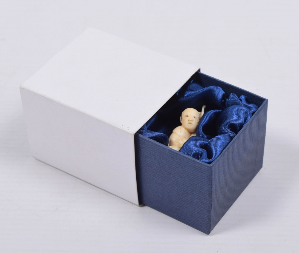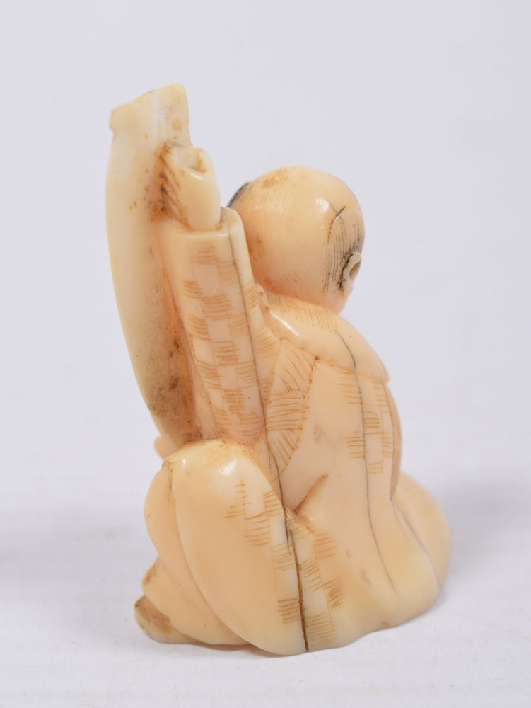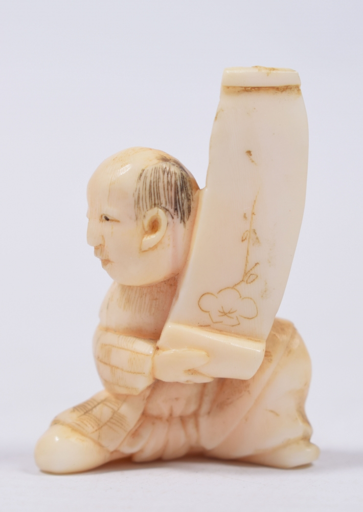Japan, 19th century. Ivory figure holding a scroll painting. Unsigned. Height 36 mm. With minor dam. to top of scroll.