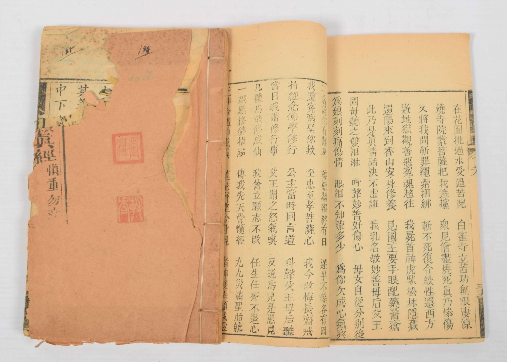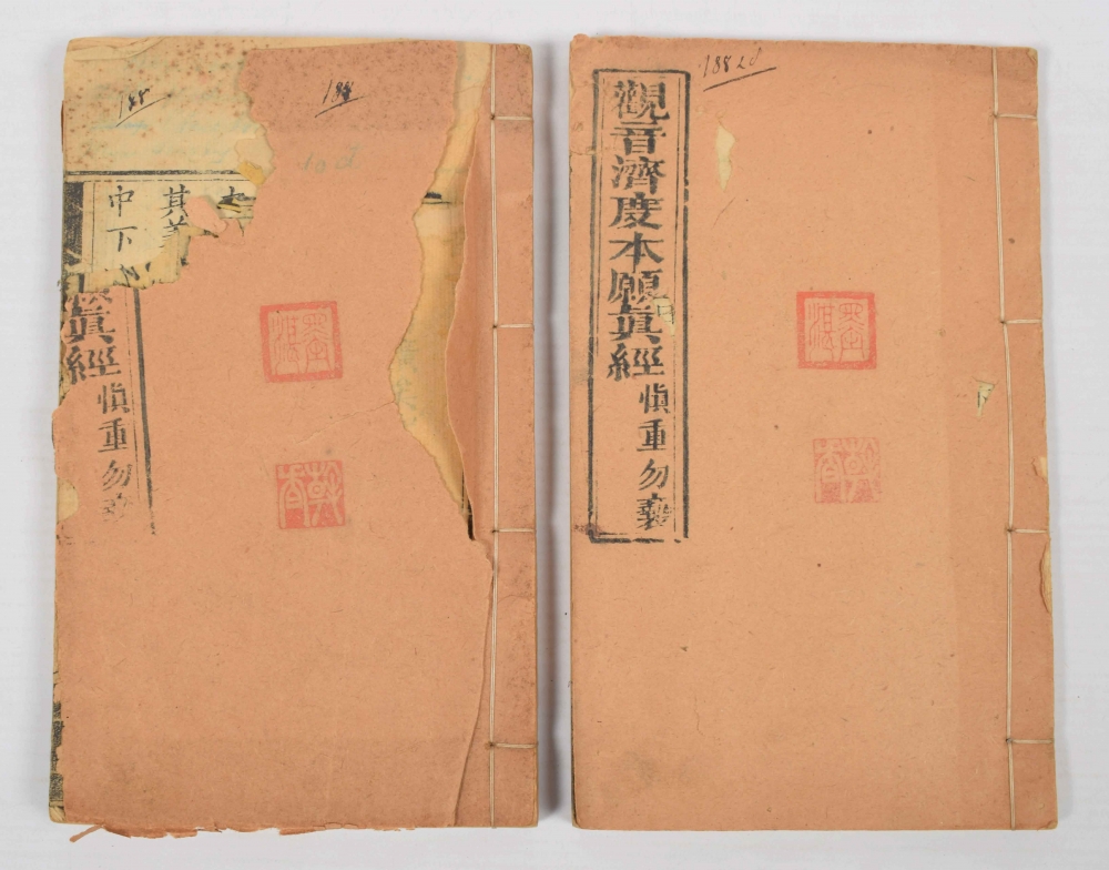 Jiang Zhiqi (1031-1104). 2 vols. China, mid-18th century. Illustrated with a woodcut of the princess Miaoshan*. First vol. with fragile wrapper. Both vols. with owner's stamps on front board. Good set of this rare early edition of this taoist work.