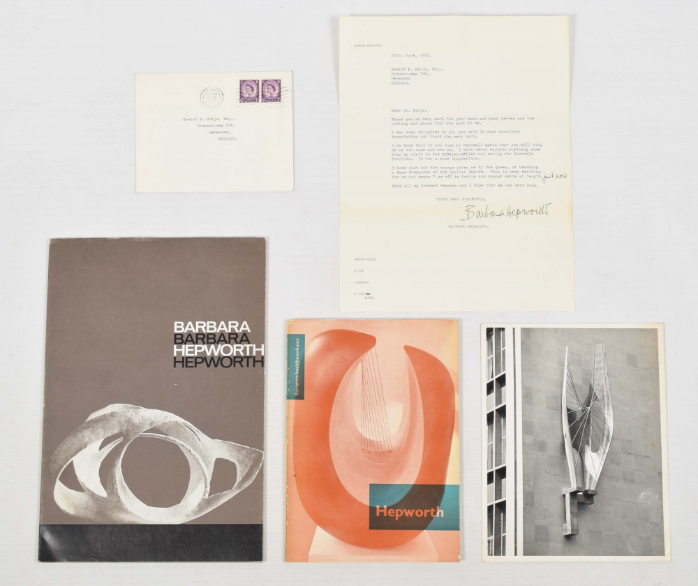 Typed and signed letters by (Dame Jocelyn) Barbara Hepworth to the Dutch journalist Roelof K. Heijs related to her visit of the Kröller-Müller Museum. 25 June 1965. 28 x 21.5 cm with 3 folds and with orig. stamped, addressed envelope. 20 typed lines on 1 page, reverse blank. On personal stationery with mention of Hepworth's Trewyn Studio. Added: exhibition catalogue for Barbara Hepworth. Kröller-Müller, 1965 + Barbara Hepworth. Europese beeldhouwkunst. A.M. Hammacher. Otto Treumann (design). Amsterdam, Allert de Lange, 1958 - and Winged Figure, gelatin silver print. Press photo, stamped on reverse 'Photo studios ltd' 1963. 16.5 x 21.5 cm.