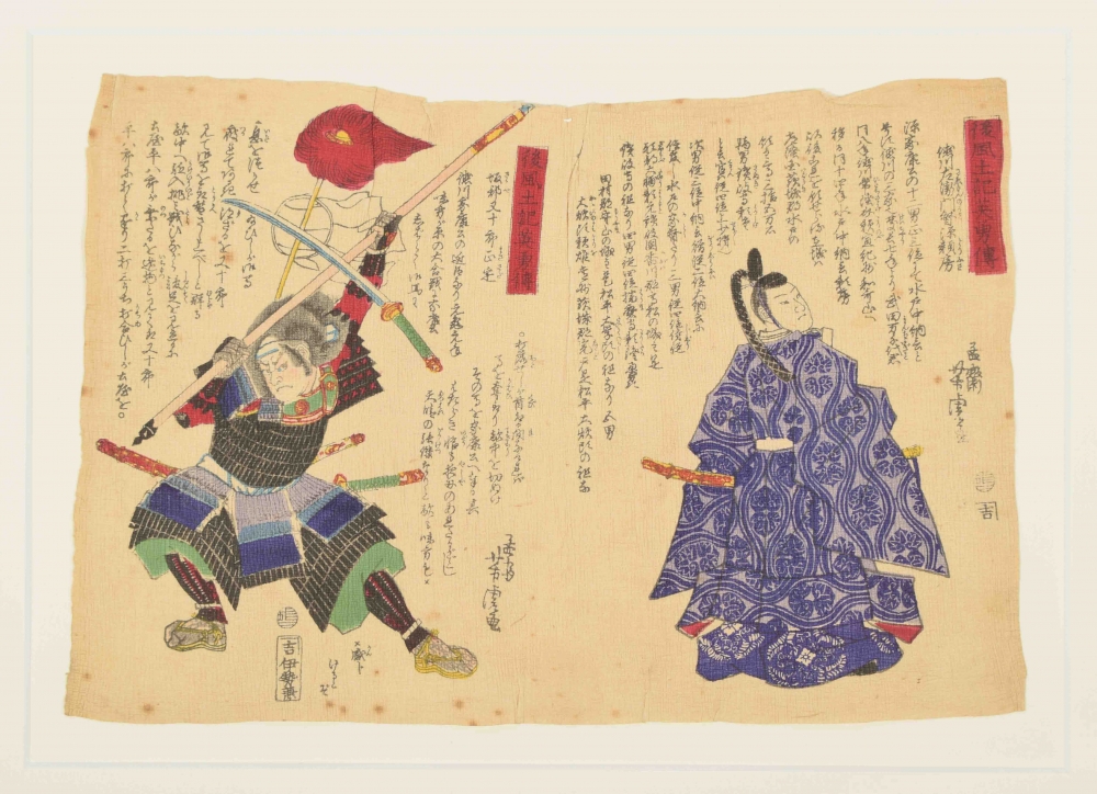 6 Japanese woodblock prints printed on Chirimen, second half 19th century. 5 scenes by Ochiai Yoshiiku (1833-1904) with warriors and 1 scene by Hiroshige II (1826-1866).