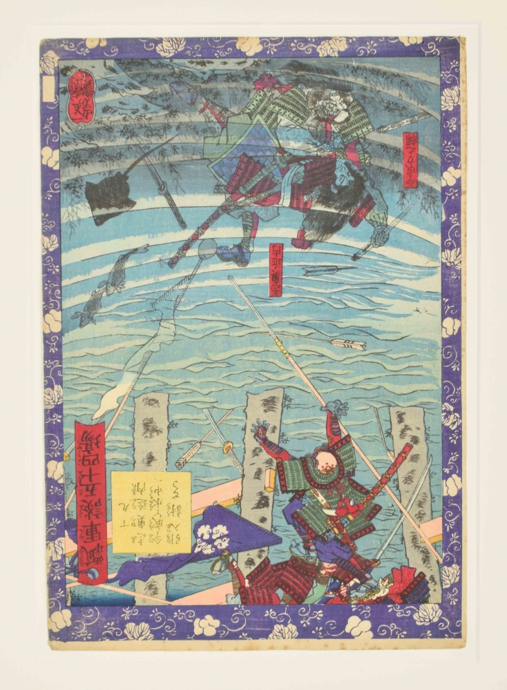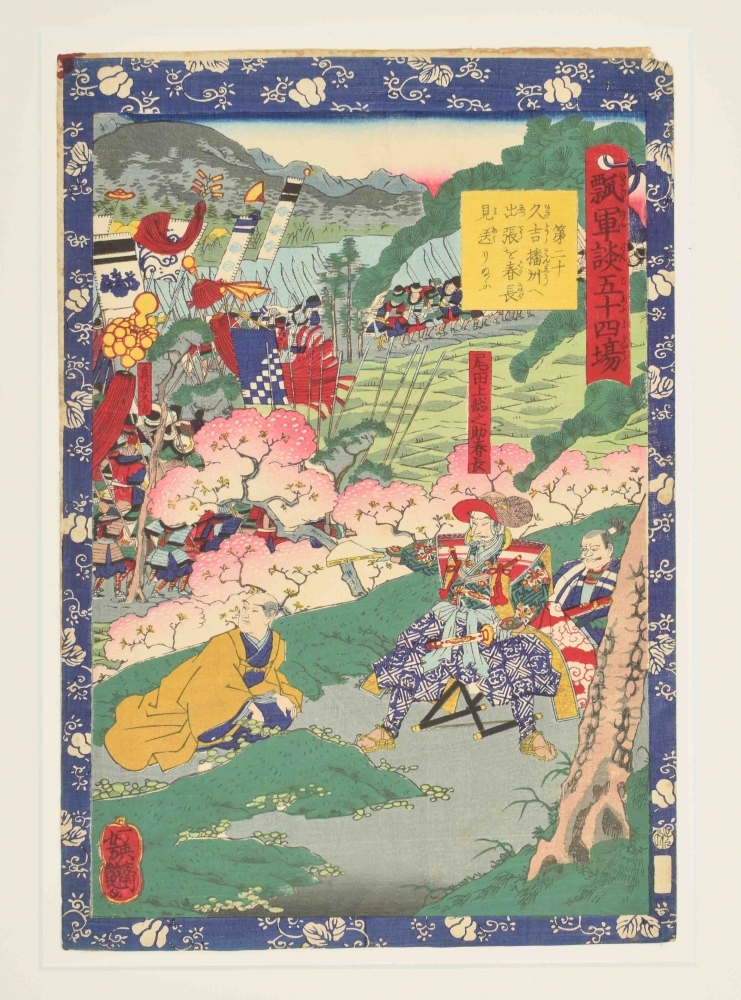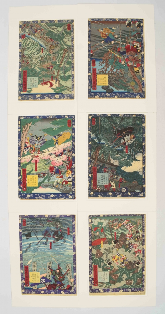 6 woodblock prints from the series Hisago gundan gojûyojô (Fifty-four Scenes from the Story of Hideyoshi), 1864. Published by Tsutaya Kichizô (Kôeidô). Oban size, pasted in mount.