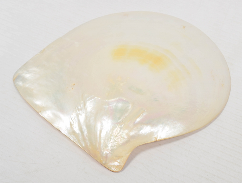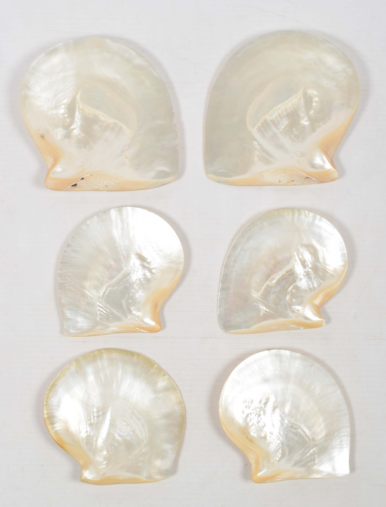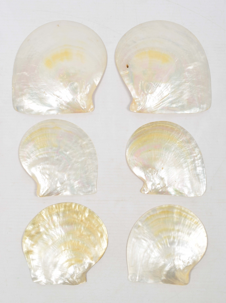 6 unworked intact mother of pearl shells, c. 1900. In box. Each 15 x 19.5 cm.