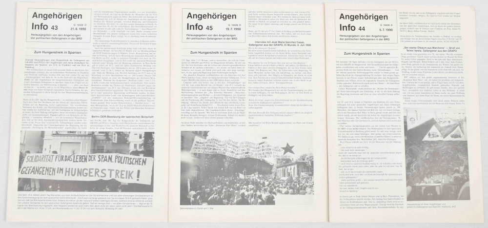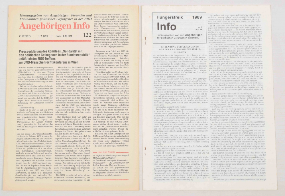 GNN-Verlag, Hamburg. Collection of 185 issues published between 1989 and 2002. Bulletin issued in relation to the hunger strike of the Rote Armee Fraction in 1989. Nos. 1-14 issued as Hungerstreik Info. After the hunger strike, the name was changed to Angehörigen Info.
