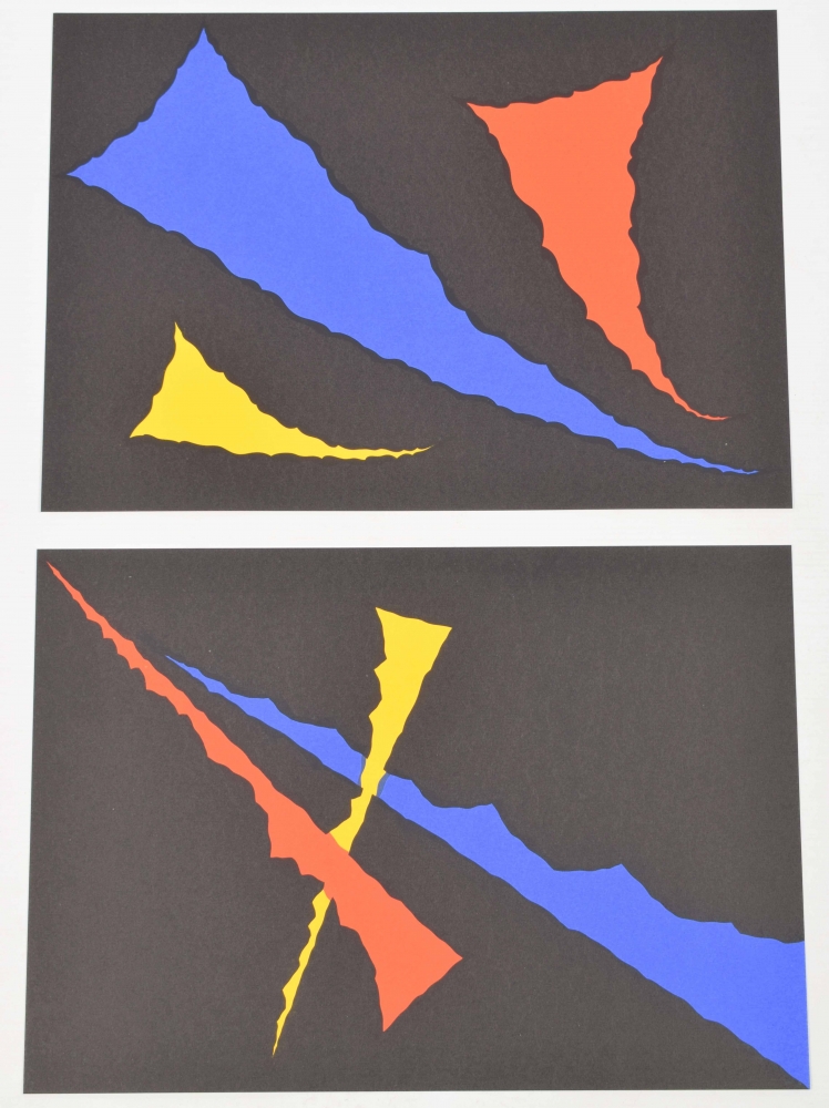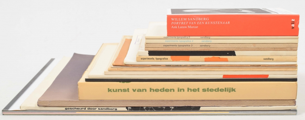 Oorkonde. Dick Elffers (design). Delft, Koninklijke Nederlandsche Gist- en Spiritusfabriek N.V., 1965. Bifolio in cardboard wrapper. Wrapper sl. toned, else good + 2 more by Dick Elffers + Experimenta Typografica, no. 11. Willem Sandberg. Cologne, Galerie der Spiegel, 1957. 2nd ed. In cardboard wrapper. Wrapper sl. toned, else good + Experimenta Typografica, nos. 1 and 3-5. Willem Sandberg. Utrecht/ Cologne, Reflex/ Galerie der Spiegel, 1979-1982. Reprint. In cardboard wrappers. Several soiled, else good + Gescheurd door Sandberg. Amersfoort/ Amsterdam, Gemeente Amersfoort/ Sud Amsterdam, 1982. Loose-leafed in folder, 28.5 x 39 cm + 8 more by or on Willem Sandberg. Added: Gielijn Escher. Zes zeefdrukken. Met inleiding door H.J.A. Hofland. Breda, De Beyerd, 1996.