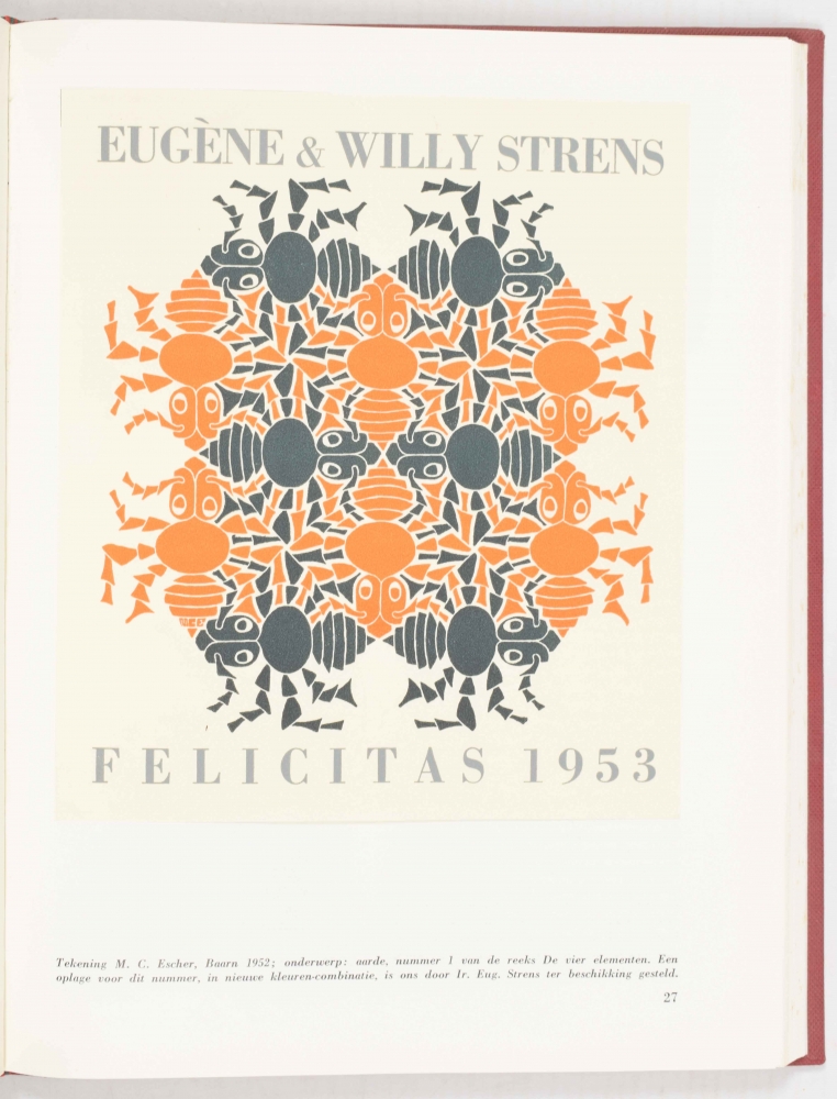 *Printed description below the print: "Tekening M.C. Escher, Baarn 1952; onderwerp: aarde, nummer 1 van de reeks De vier elementen. Een oplage voor dit nummer, in nieuwe kleuren-combinatie, is ons door Ir. Eug. Strens ter beschikking gesteld."