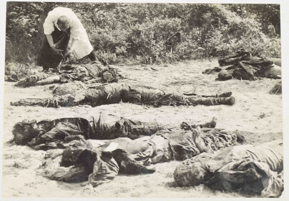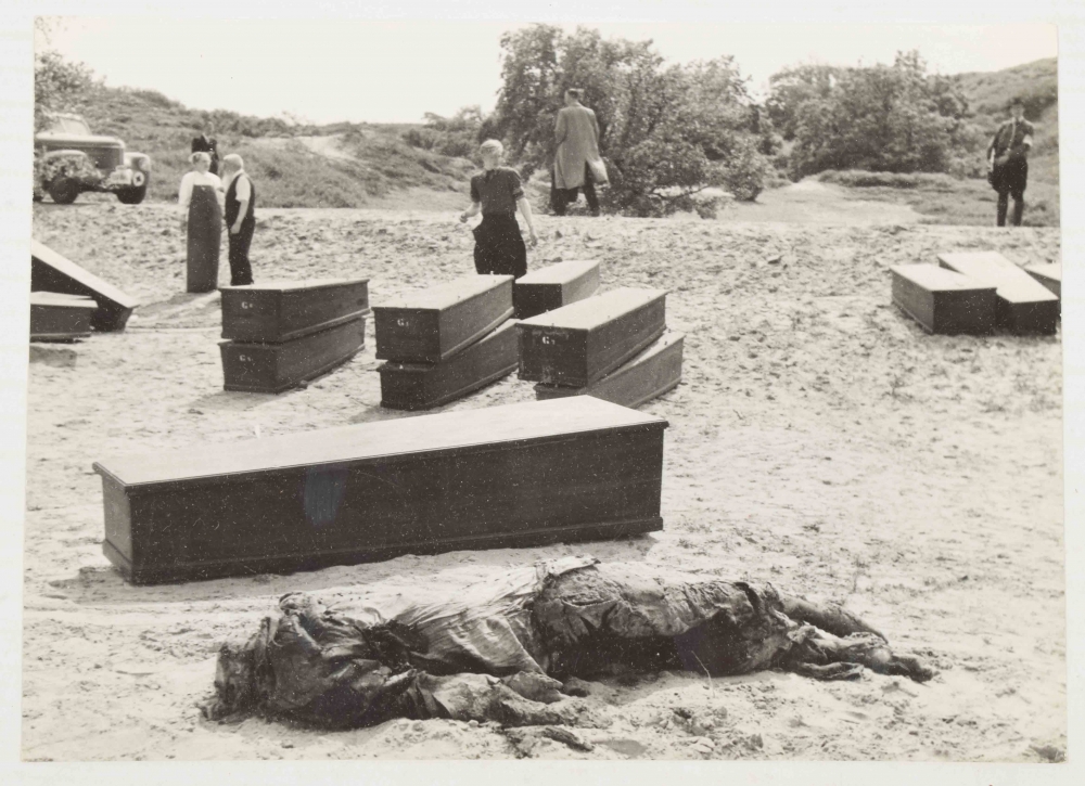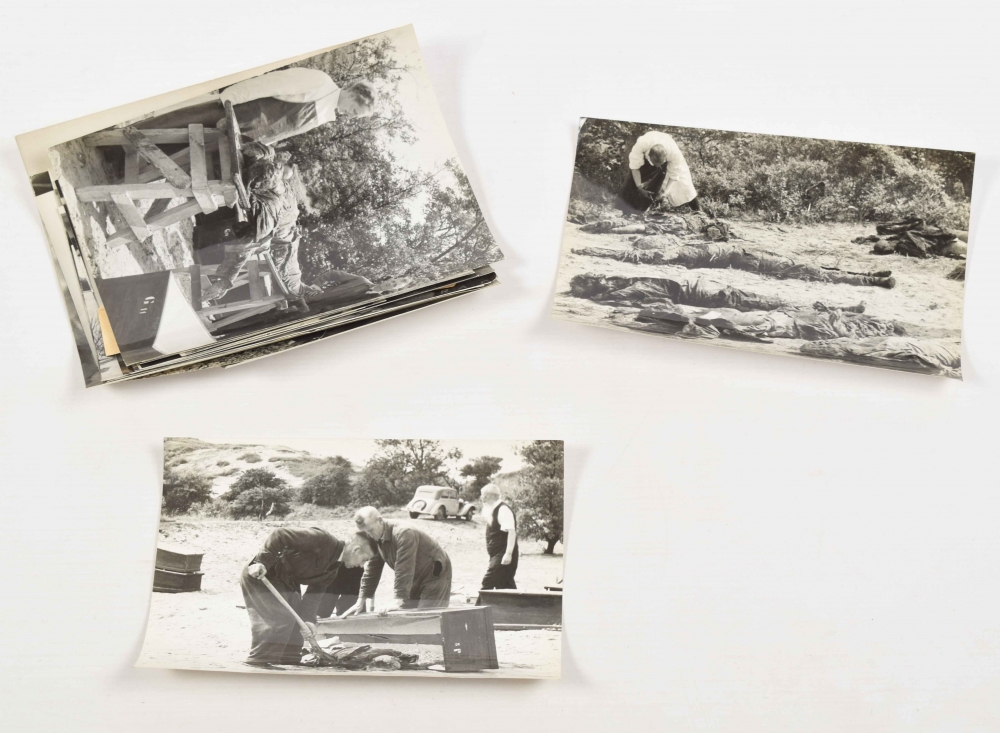 6 photos of the identification of the mass grave at Overveen with pathologist S.P.L Hulst and M.B.E. Nilant. Photographed by Willem van de Poll, stamped on reverse, copyright "Anefo" Algemeen Nederlandsch Fotobureau. With short explanation for the press mounted on reverse. 5x 16.5 x 23.5 cm - and 1 small size. With: another 16 photos related to the war, incl. 'Uitdelen van groenten door tuinders onder toezicht van de N.B.S.'; Noodhospitaal in een school in ten Boer, waar prof. Eerland een door granaatscherf gewonde vluchteling helpt'; 'Duitse parachutisten trekken Nederland in, 1940', stamp Anefo, 1945; etc.
