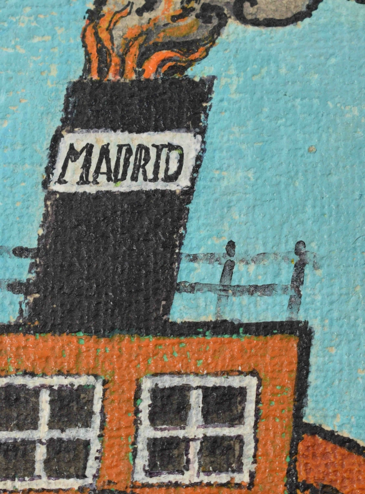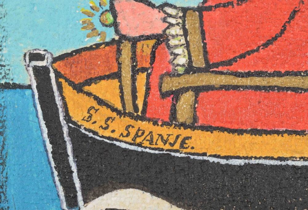 Ceramic tile with image of Sinterklaas aboard his steamboat. Reverse with signature and stamped mark and title "De goed-heilig man". Unica, c. 1980. Executed by his own studio.