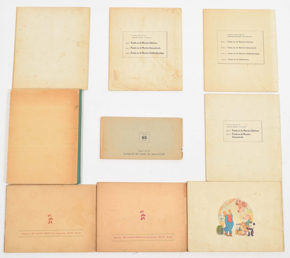 Panda en de Meester-Kruidenier. SV de Volharding, 1959. Incomplete, 60 (out of 92) picture cards. Several cards slightly damaged. Appears to be taped near the staples, else a good copy + Panda en de Meesterdief. De Bezige Bij, hc in halfcloth, 1950. Cover and edges slightly torn, inside in good condition + Panda en de Meester Detectief. Het laatste Nieuws, Brussels, 1950. Oblong, stapled. Small rubbed spot on front cover, minor dam., fairly good copy + Panda en de Meester Dief (idem). Front cover dam. and with ink stripes by a child's hand, first 3 pages coloured with crayon + Panda en de Meester-gemaskerde + de Meester-Edelman + de Woudreuzen + de Meester-Oudheidkundige. De Muinck & Co, 1952-53 + Panda en de meestervlieger. Dagblad De Gooi- en Eemlander, 1948. Oblong, stapled. Staples rusty, name on front cover.