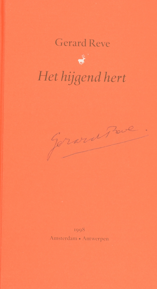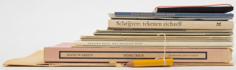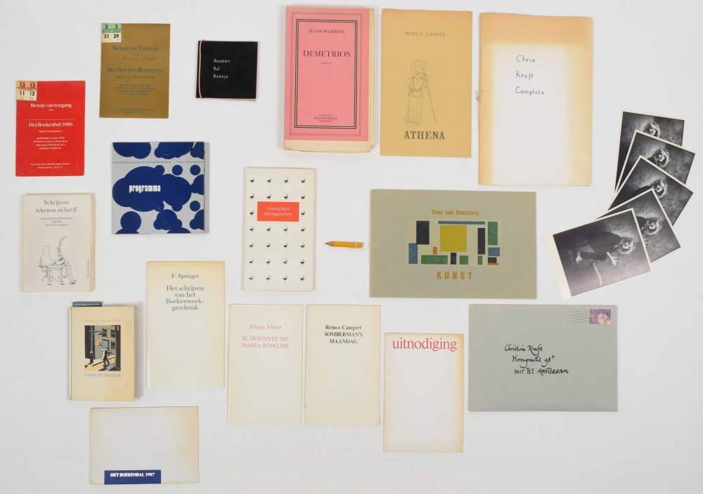 Boeken Bal Boekje 1993, Boekenbal envelope with 5 cards by Tessa de Loo, 1987; Remco Campert. Somberman's Maandag. Toespraak uitgesproken tijdens de persbijeenkomst t.g.v. Boekenweek 1985; Marga Minco. Ik herinner me Maria Roselier. (Idem), 1986; F. Springer. Het schrijven van het Boekenweek-geschenk. (Idem), 1990 + Hans Warren. Demetrios. Proza. Amsterdam, Bert Bakker, 1976. One of 30 numbered and signed copies on uncut paper; Het hijgend hert. Gerard Reve. L.J. Veen, 1998. Leporello, signed; Theo van Doesburg. Kunst. De Uitvreter, 1993, one of 50 copies with accompanying pencil - and 5 more.