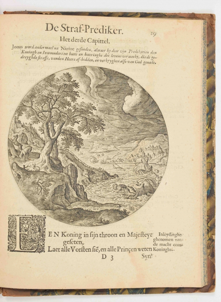(...) Midtsgaders de deughde van Pub. Cornel. Scipio, bewesen aen een Spaensche edel-juffer van Carthago, die hy haren bruydegom wederom vereerde. Amsterdam, Dirck Pietersz. (Pers), 1624. 4to. (12), 81,(3) p. With title plate and 3 other plates + Ionas de Straf-Prediker: van Gode afgesonden, om die van Ninive tot boete ende beteringe des levens op te wecken (...) In dicht gesteld door Theod. Petrejum. P. Amsterdam, Dirck Pietersz, 1623. (8), 88, (4) pp. Titelplate and 2 other plates. Damp stain in right-hand margin of several pp.