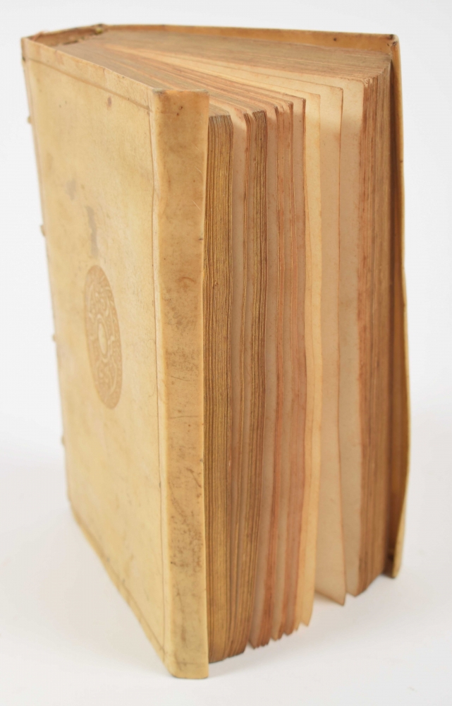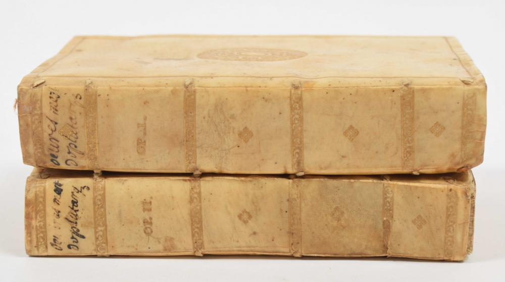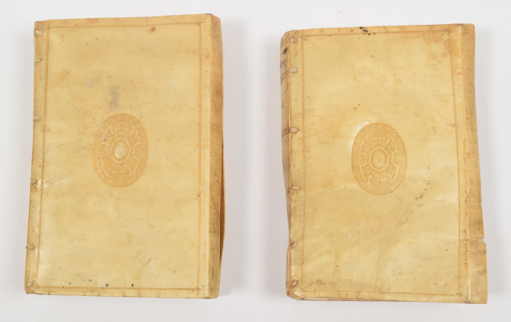Parts 1 and 2 of vol. I (of a total of 7 parts in III vols.). Small 8vo, limp turned vellum, ms. title on spine, boards with gilt-stamped vignette, 2 titles, 336-607 (of 624) ff. (= 1214 pp.), 2x headpiece and several woodcut capitals. Incomplete set; the second part lacks ff. 608-624, var. ms. ann., shabby bindings.