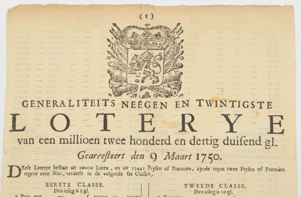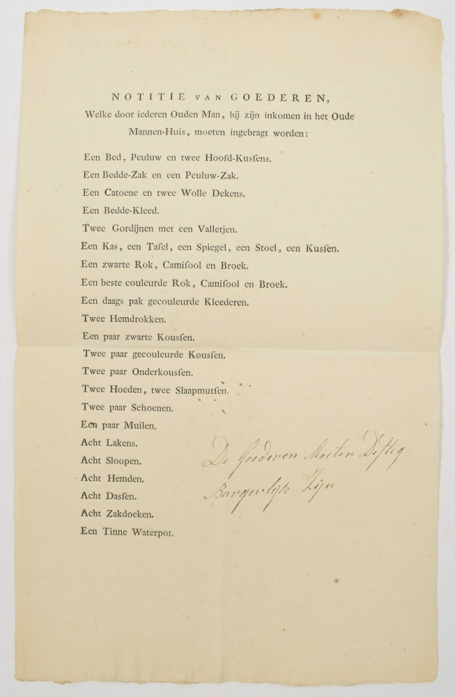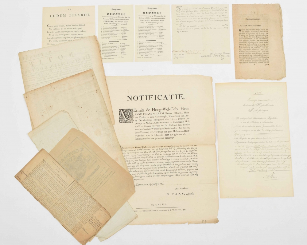 Diverse lot with several (extremely) rare items, incl.: (1). Predikbeurten. 24. Zondag 14 Juny 1812. Vroegpreek ten 7 uren. Voormiddag ten half tien uren, Namiddag ten twee uren. Avond ten 5 uren. Letterpress list printed on one side with sermons for the various churches of The Hague, printed Susan et Fils, Spuistraat No. 19 (The Hague) for J. Haefkens, drie Hoekjes, Lo. 30 (The Hague), text in two columns in French and in Dutch, leaf size 20.5 x 8.5 cm. Extremely rare flyer, possibly the only remaining copy; (2) Notitie van goederen, welke door iederen ouden man, bij zijn inkomen in het Oude Mannenhuis, moeten ingebragt worden. Single leaf printed on one side with list of goods, no address or date (Haarlem, c. 1800), leaf size 33 x 20.5 cm. With recto in contemporary pen the ann. "De goederen moeten deftig burgerlijk zijn" and in the same hand verso "Binnen Haarlem"; (3) Generaliteits neegen en twintigste Loterye van een millioen twee honderd en dertig duisend gl. Gearresteert den 9 maart 1750. Single-leaf list printed on both sides, issued by Jacobus Scheltus at The Hague, 1750, leaf size 33.5 x 16.5 cm. And with 12 various other items. (total 15)